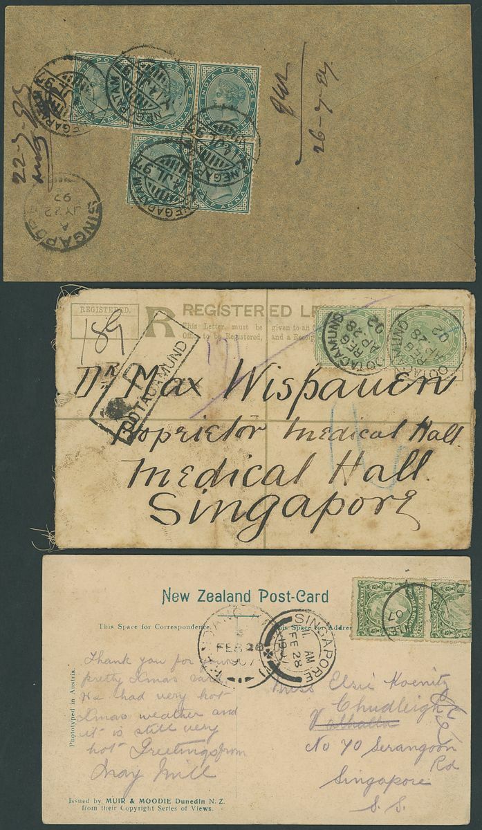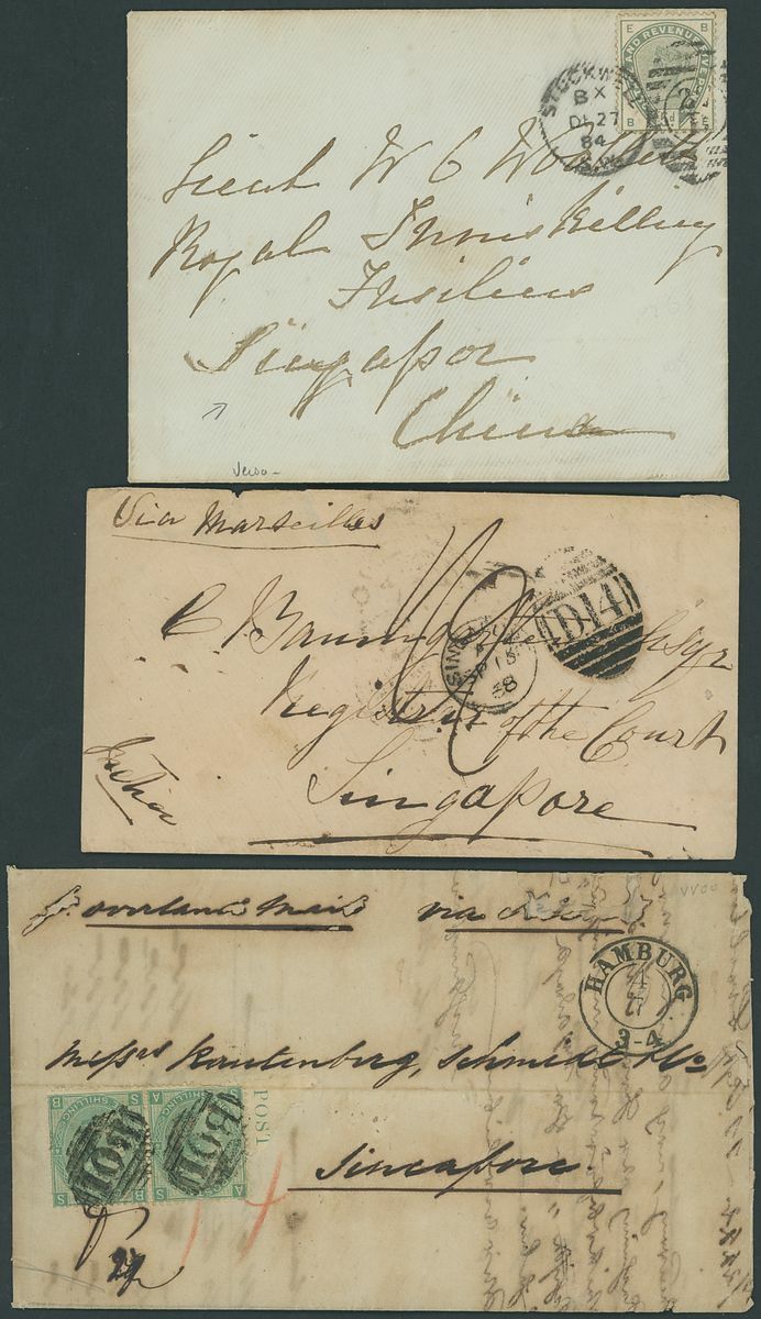 1865-1917 selection (10) including 1865 entire from Alexandria, Egypt marked per overland mail bearing GB 1/- pair cancelled by B01 obliterator, 1868 stampless envelope from Towyn, 1884 envelope from Stockwell bearing 1883-84 5d. green, 1886 envelope from Germany showing