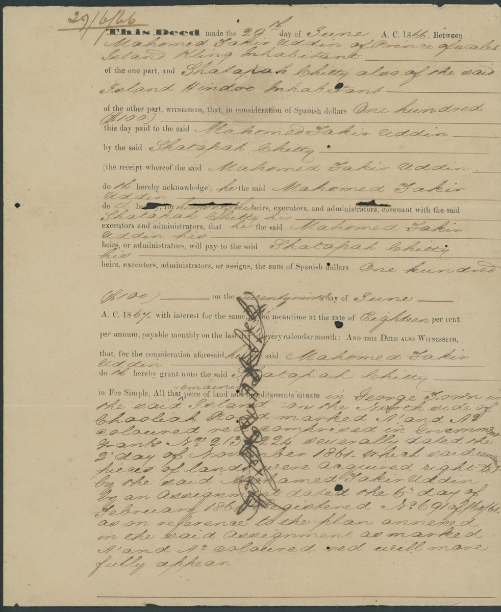 1866 (29 June) loan agreement in Penang showing clear impression of 2 Rupee Calcutta type embossed handstamp; some small faults