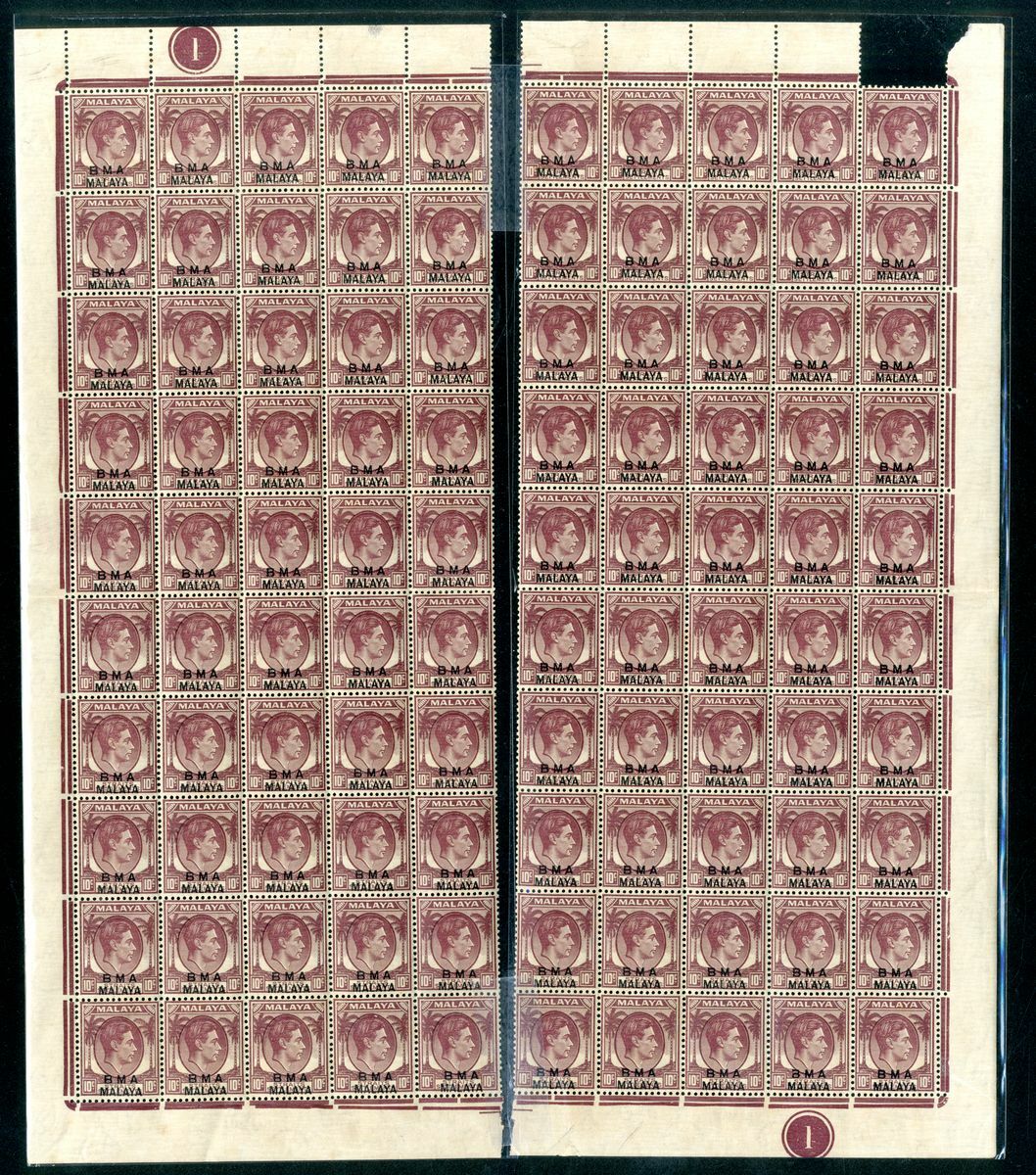 Melbourne Printings (June-July 1946), 10c. dull purple on striated paper, a complete mint sheet (10x10), split in half vertically and piece of margin missing at upper right, otherwise fine unmounted. The only sheet of this value known on this paper. S.G. 8d, £2,200