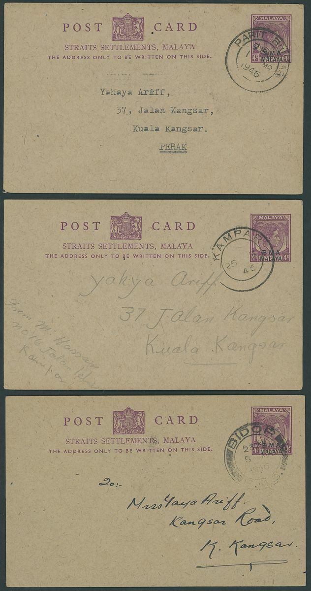 1946 (1 Mar.) - (25 Mar.) 4c. magenta cards (3) used from Bidor, Kampar and Parit Buntar to Kuala Kangsar, fine used