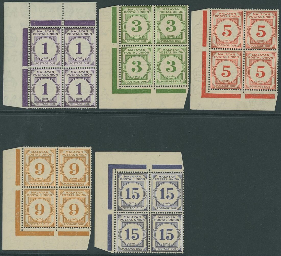 1945-49 1c. to 20c. set of seven in corner blocks of four plus 8c. and 20c. perforated