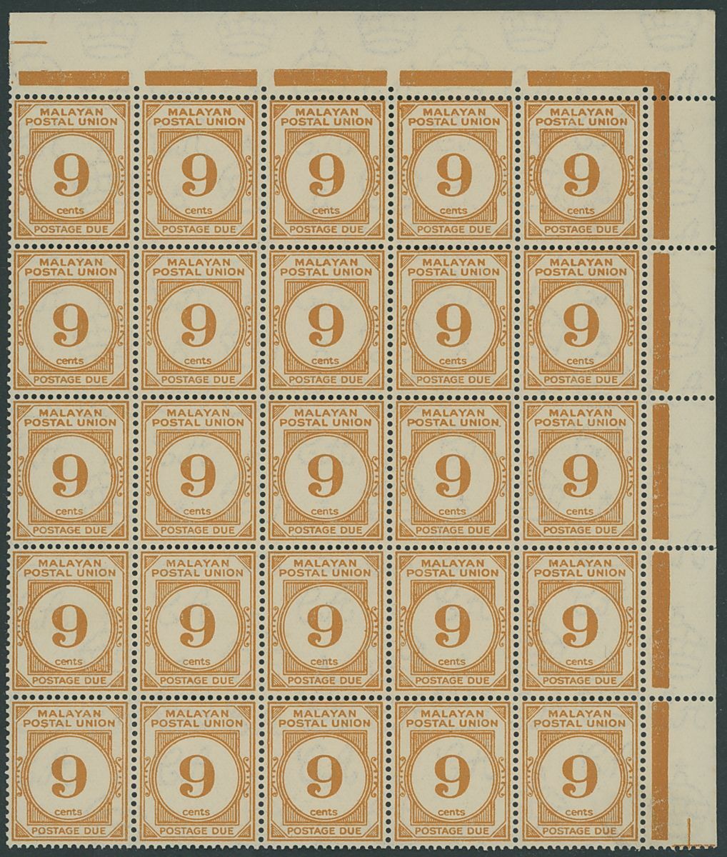 1945-49 9c. yellow-orange top right corner block of twenty-five, fine mint. S.G. D11, £1,050