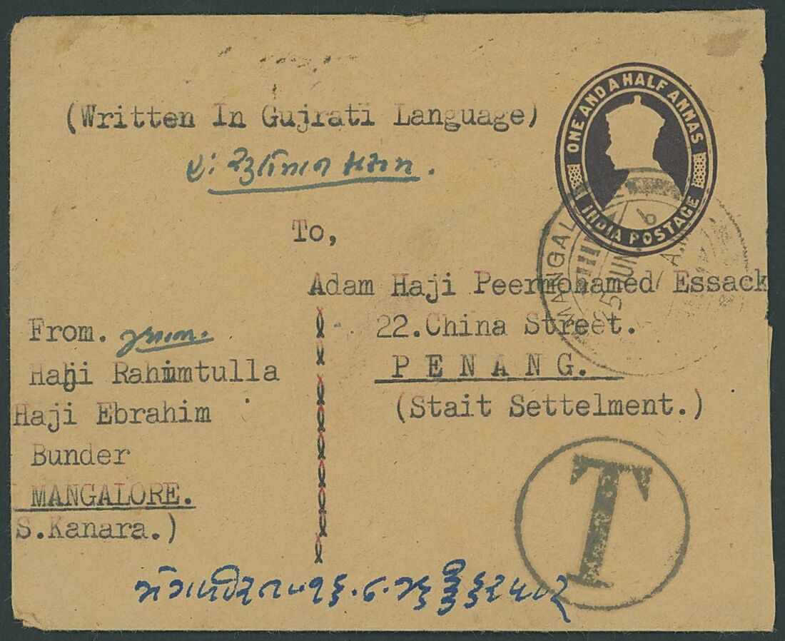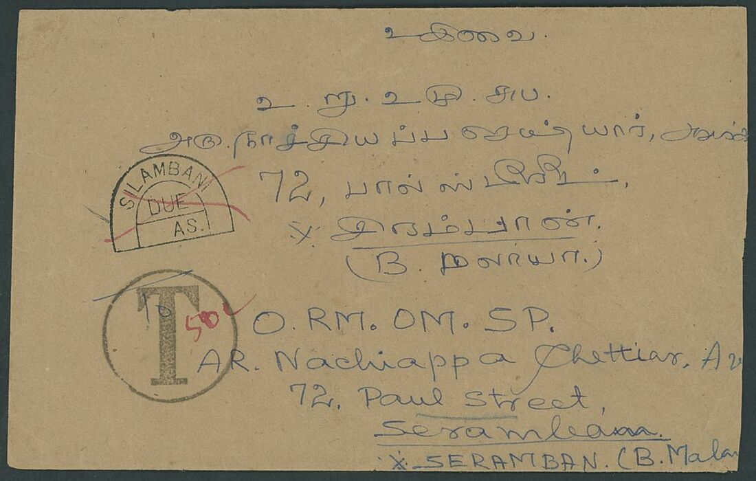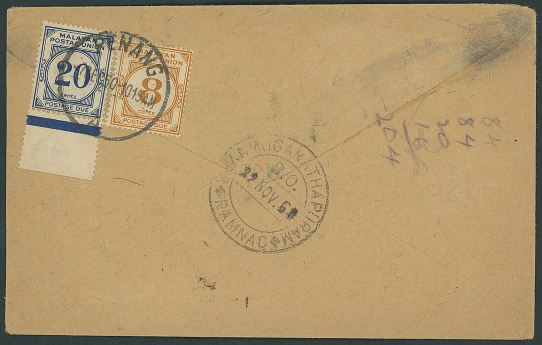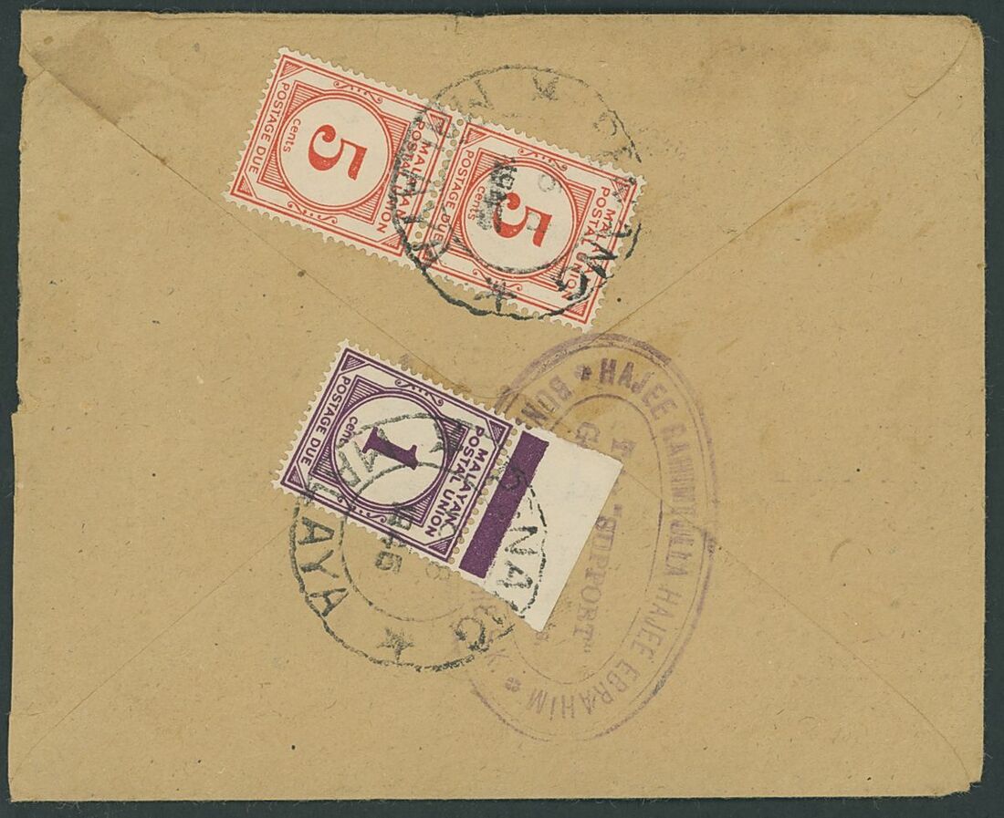 1946 (25 June) India 1½a. stationery envelope to Penang showing tax markings and bearing, on reverse, Postage Due 1c. and 5c.vertical pair tied by arrival c.d.s.; 1947 (25 Nov.) unstamped envelope from India to Seremban showing tax markings and bearing, on reverse, Postage Due 1c. and 6c. (3) tied by arrival c.d.s.; and 1950 (22 Nov.) unstamped envelope from India to Penang showing tax markings and, on reverse, Postage Due 8c. and 20c. tied by arrival c.d.s. A fine trio of covers