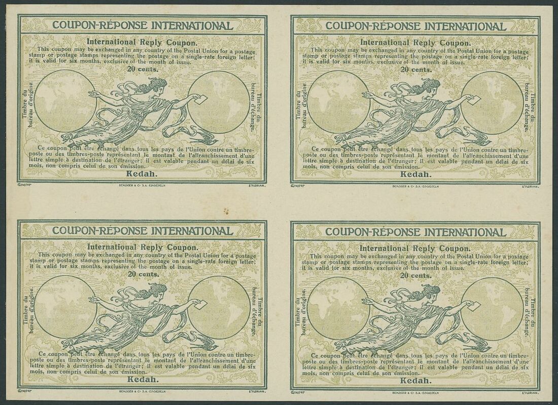 International Reply Coupon 1925 20c. uncut block of four. Some staining otherwise fine. Presented to King Farouk at the 1934 UPU Congress in Cairo. Believed to be unique outside the Universal Postal Union Archives.