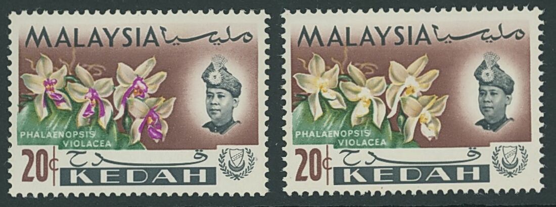 1965 Orchids 20c., variety bright purple (blooms) omitted, fine unmounted mint. With normal for comparison. S.G. 121a, £550