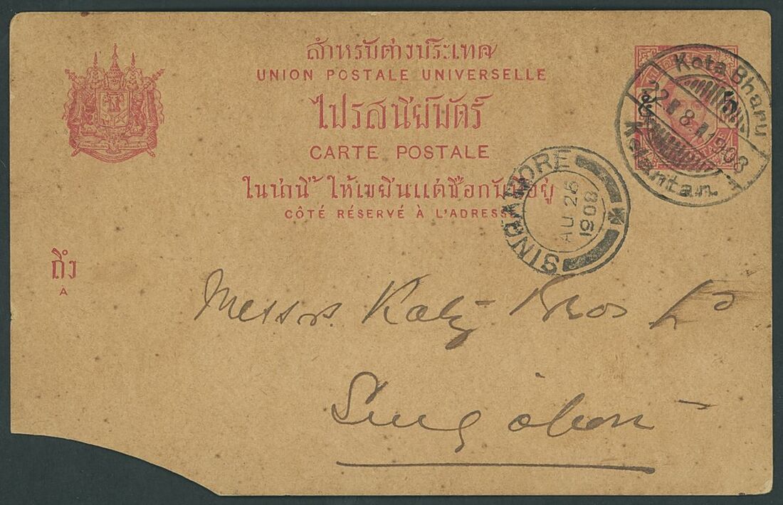 1908 (22 Aug.) "5" on 4a. carmine stationery card (1906 issue) to Singapore, cancelled by fine strike of "Kota Bharu/Kelantan" double-ring d.s. (Type E) and showing arrival c.d.s. alongside; the card with lower right corner missing. Very rare