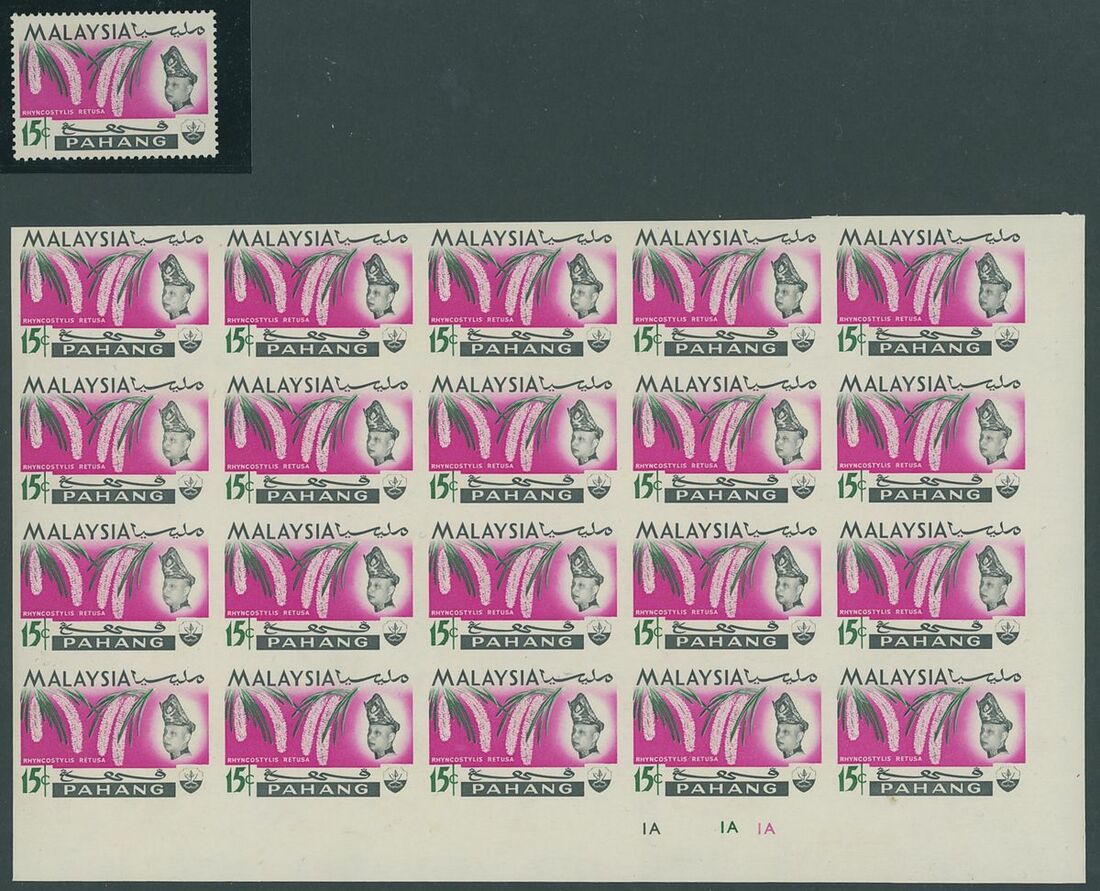 1965 Orchids 15c., a lower right corner block of twenty (5x4) with plate numbers, variety imperforate, fine unmounted mint. S.G. 92var