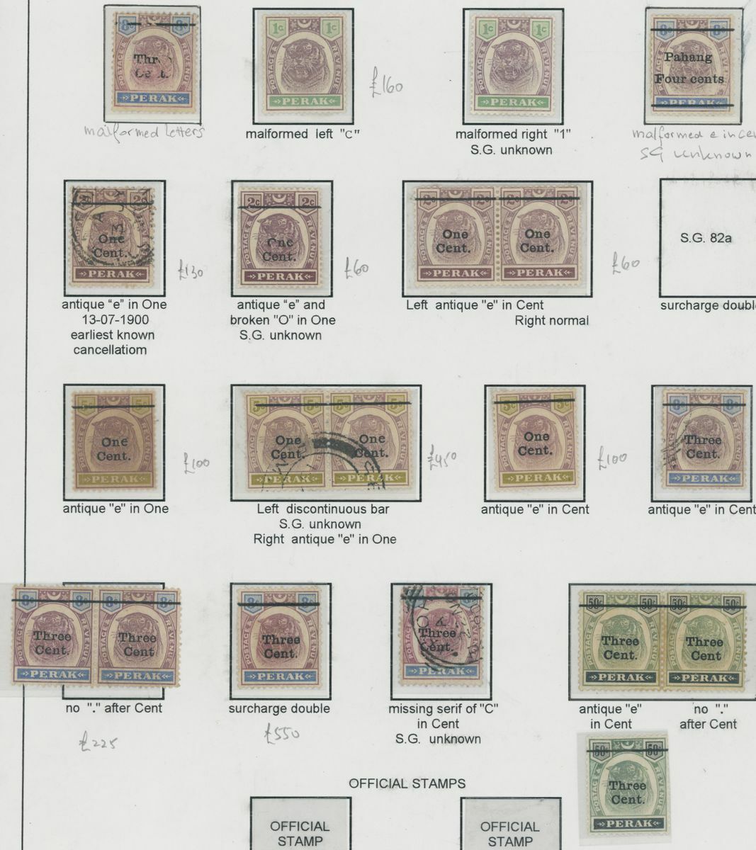 1895-99 and 1900 surcharges, selection (20), including 1c. malformed "C" at left, 1900 with errors with 3c. on 8c. surcharge double, 3c. on 50c. pair, one antique "e" in "Cent", the other no stop after "Cent", etc., mixed condition