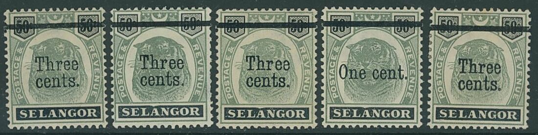 1900 1c. on 50c. green and black and 3c. on 50c. (2) "dented frame" variety, 3c. on 50c. antique t" variety, large part original gum; some faults but fine appearance. S.G. 66bd, 67a, 67b