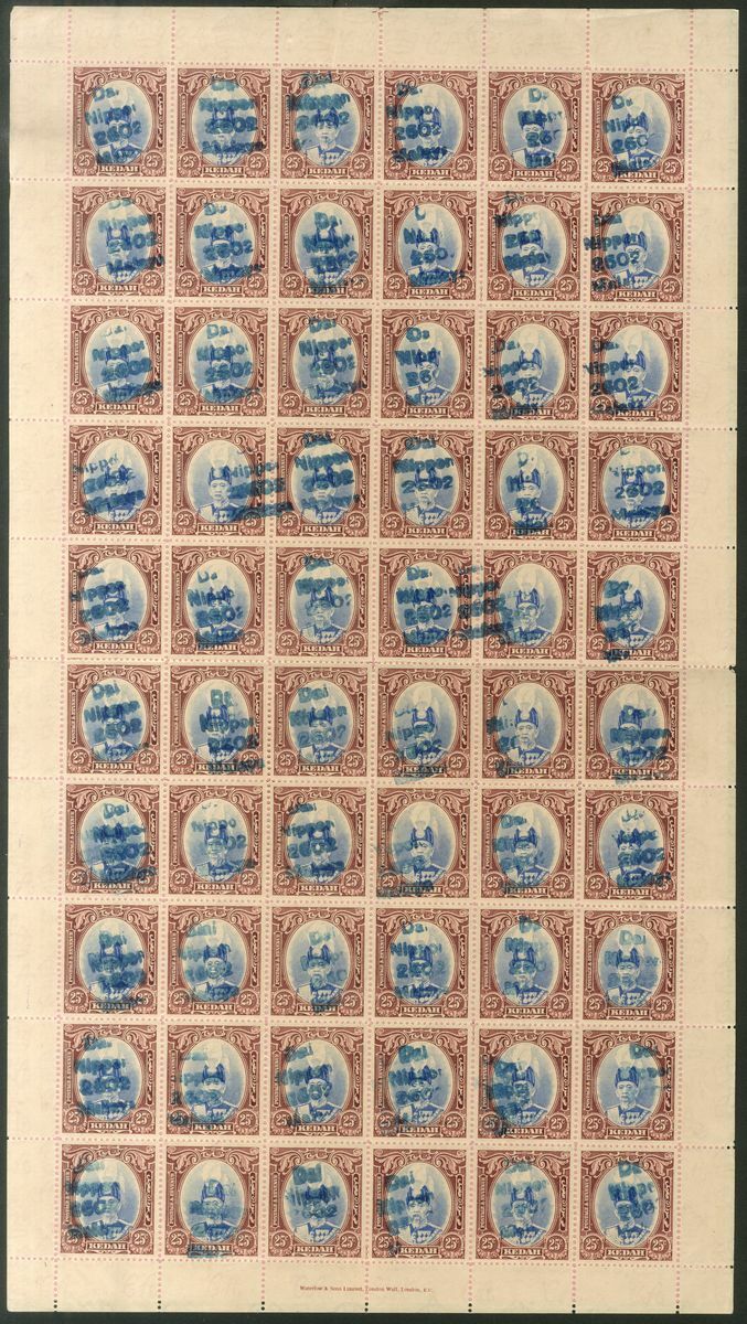 1942 25c. ultramarine and blue handstamped "Dai Nippon/2602/Malaya" in blue, a complete sheet of sixty (6x10) with pink backing paper on reverse, fine. A rare multiple. B.P.A. Certificate (2021). Barefoot 52; McClellan No. P12