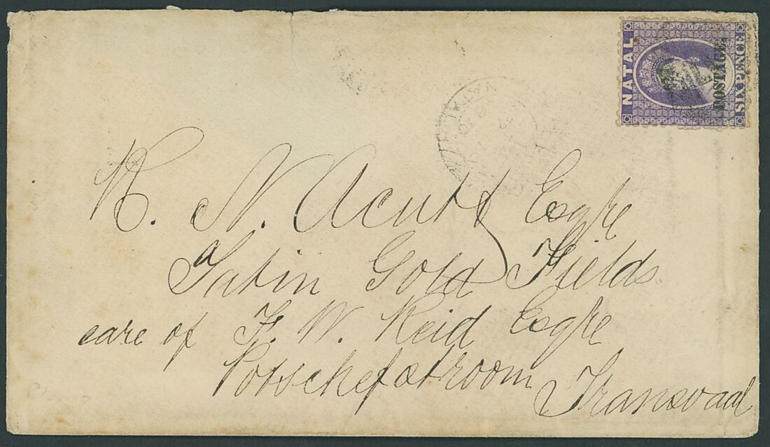 1870 (20 Sept.) envelope addressed to "R.N. Acutt, Tatin Goldfields, care of F.W. Reid, Potchefstroom", bearing 1869 6d. violet overprinted