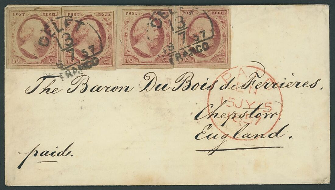 1852-63 10c. carmine, four singles, arranged as a strip of four on small envelope to The Baron Du Bois de Ferrieres (Liberal M.P. for Cheltenham, 1880-85), Delft half round cancellations of 13 July 1857, red Paid London c.d.s. alongside, Chepstow arrival (16.7) on reverse; fine and attractive