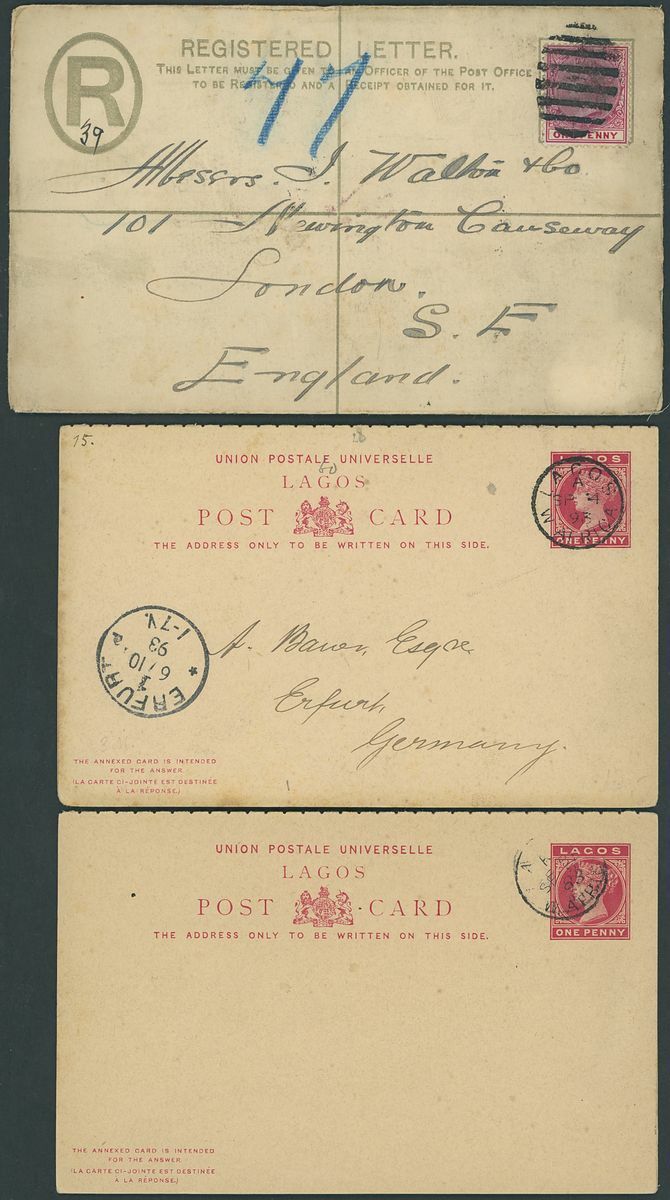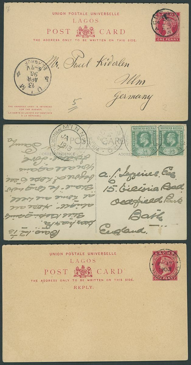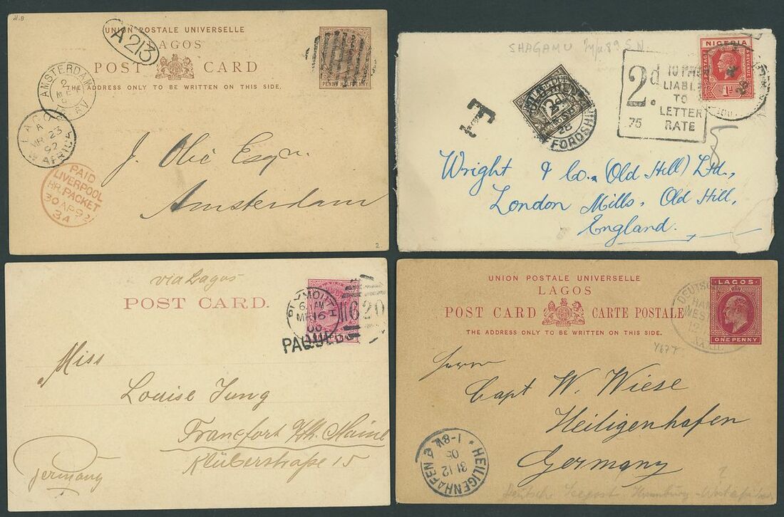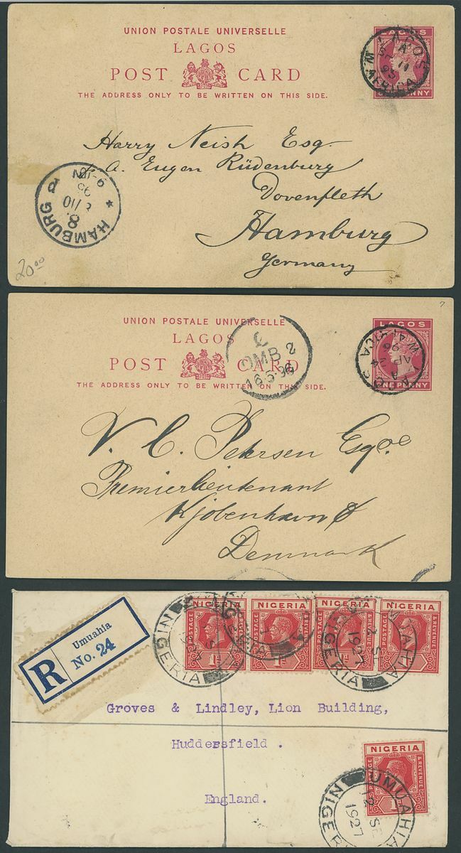 1892-1949 postal history selection (32) including 1892 1½d. postal stationery card to Amsterdam, 1900 picture postcards (views of Lagos) to Germany bearing Lagos 1d. tied by Plymouth "620" duplex (16.3 and 1.6) and showing unframed