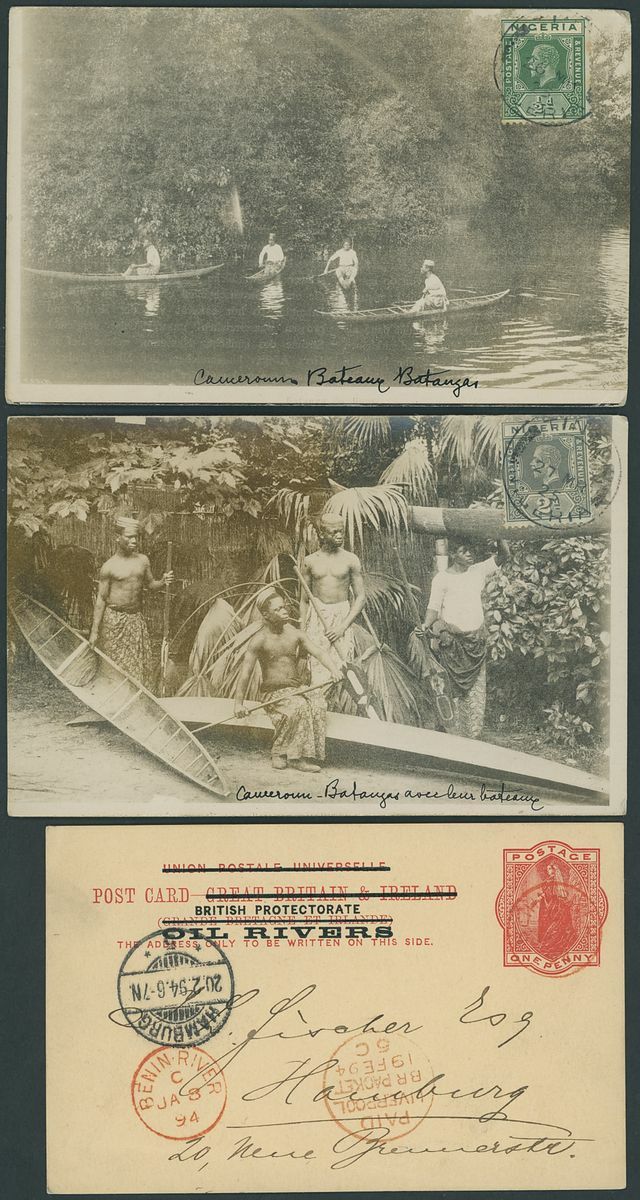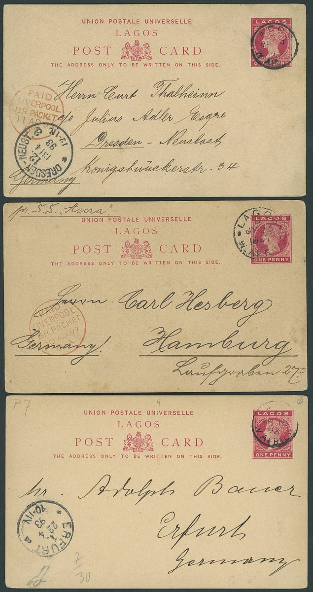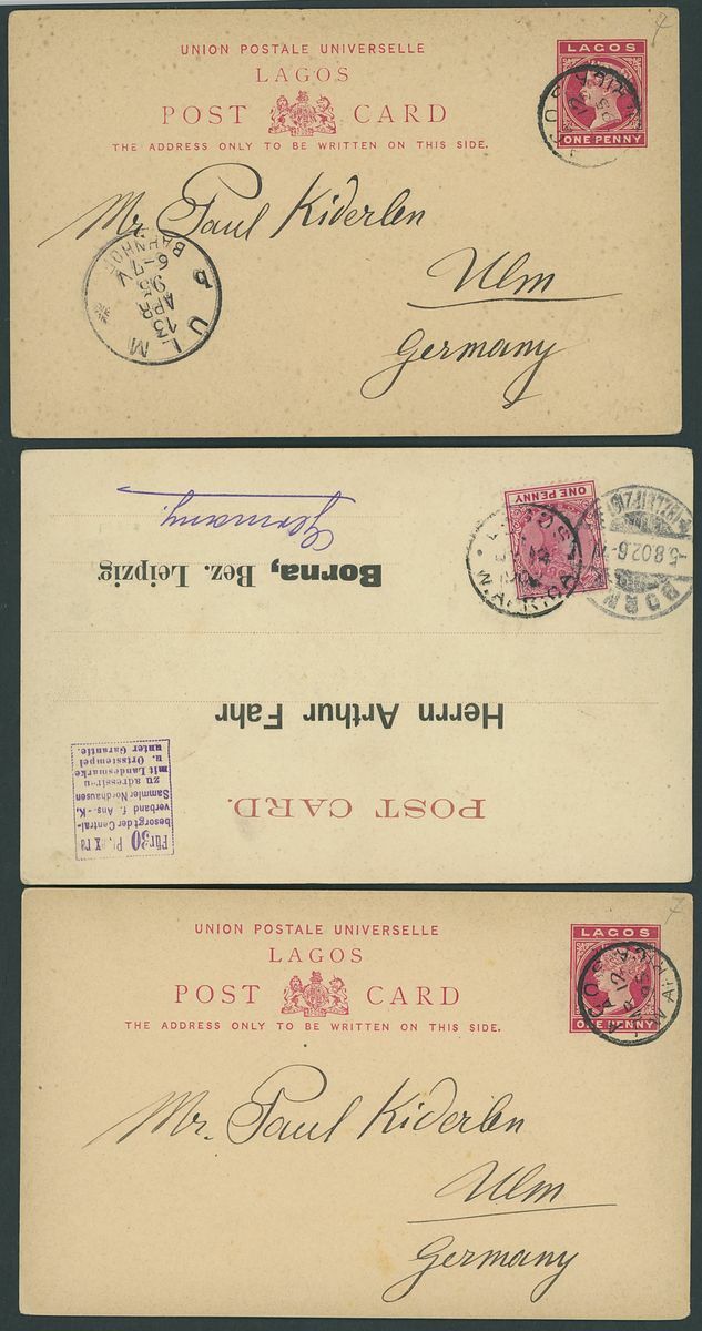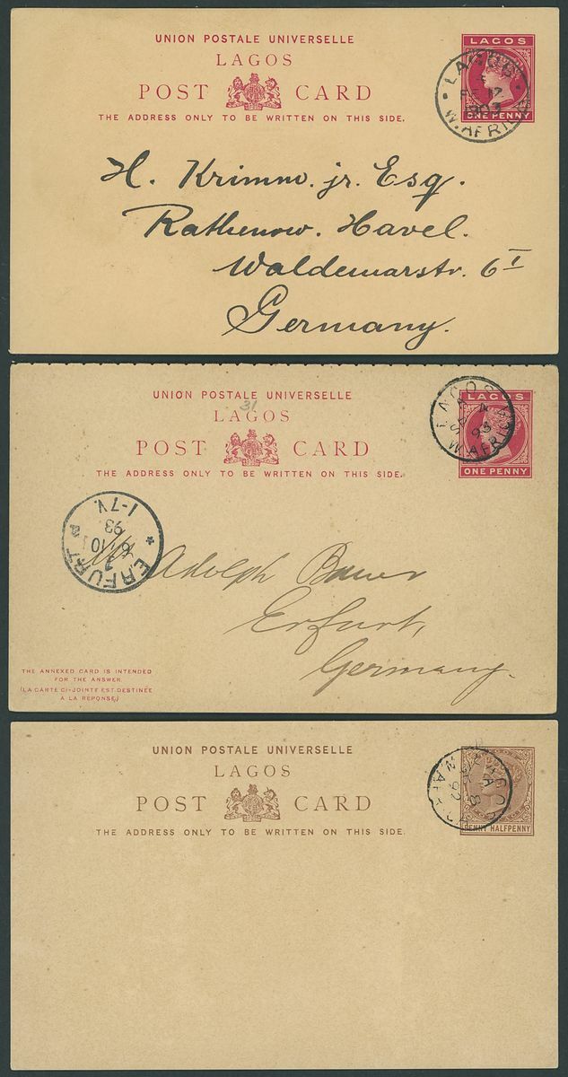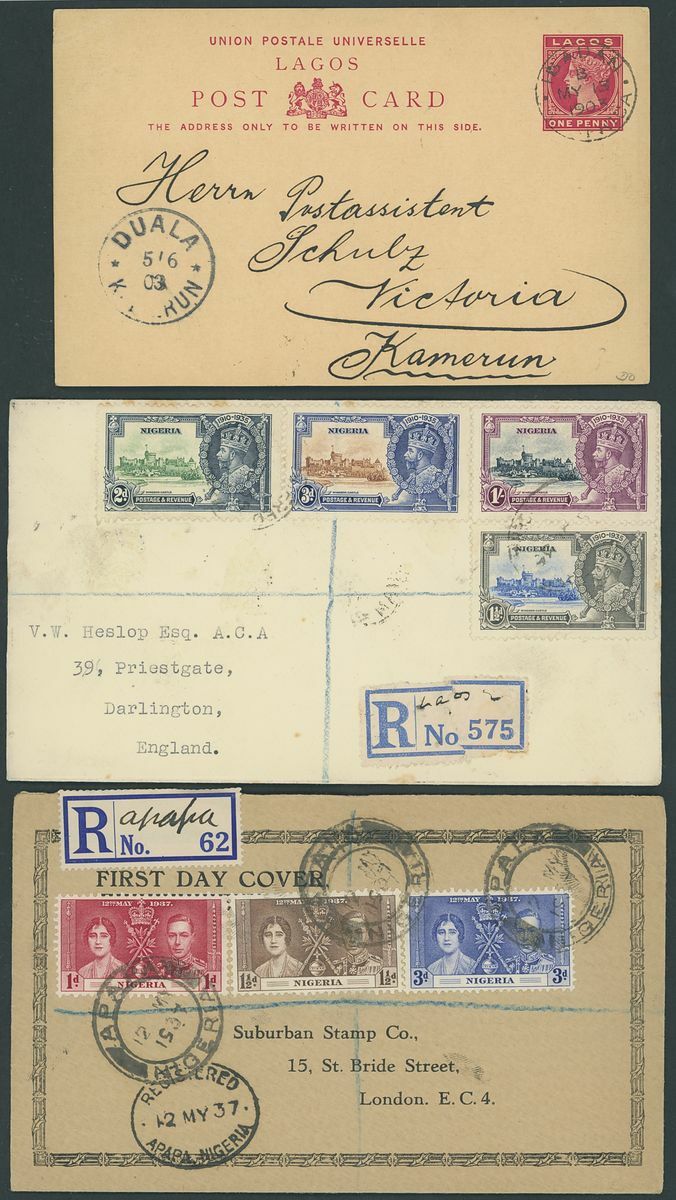 1892-1949 postal history selection (32) including 1892 1½d. postal stationery card to Amsterdam, 1900 picture postcards (views of Lagos) to Germany bearing Lagos 1d. tied by Plymouth "620" duplex (16.3 and 1.6) and showing unframed