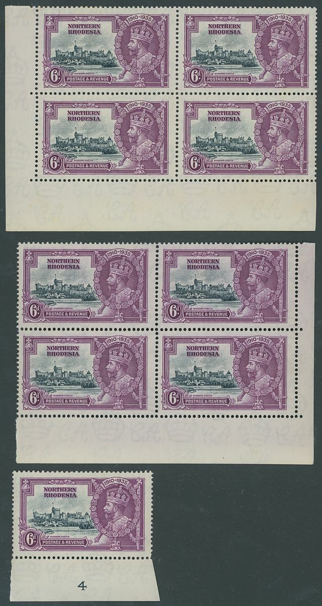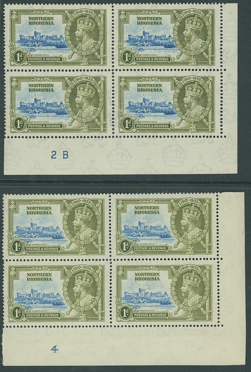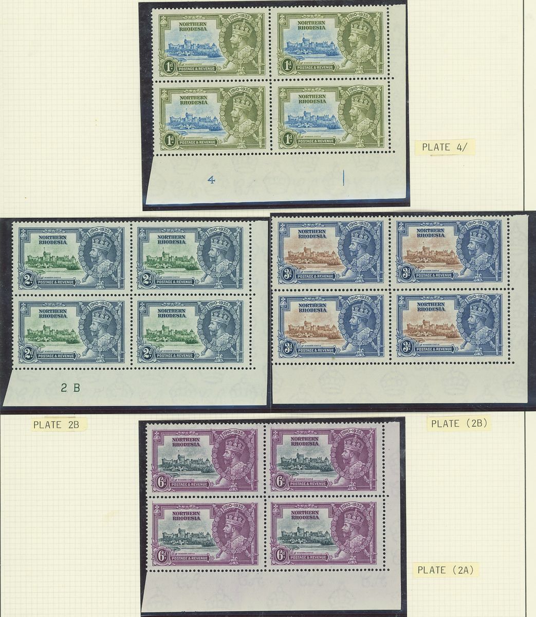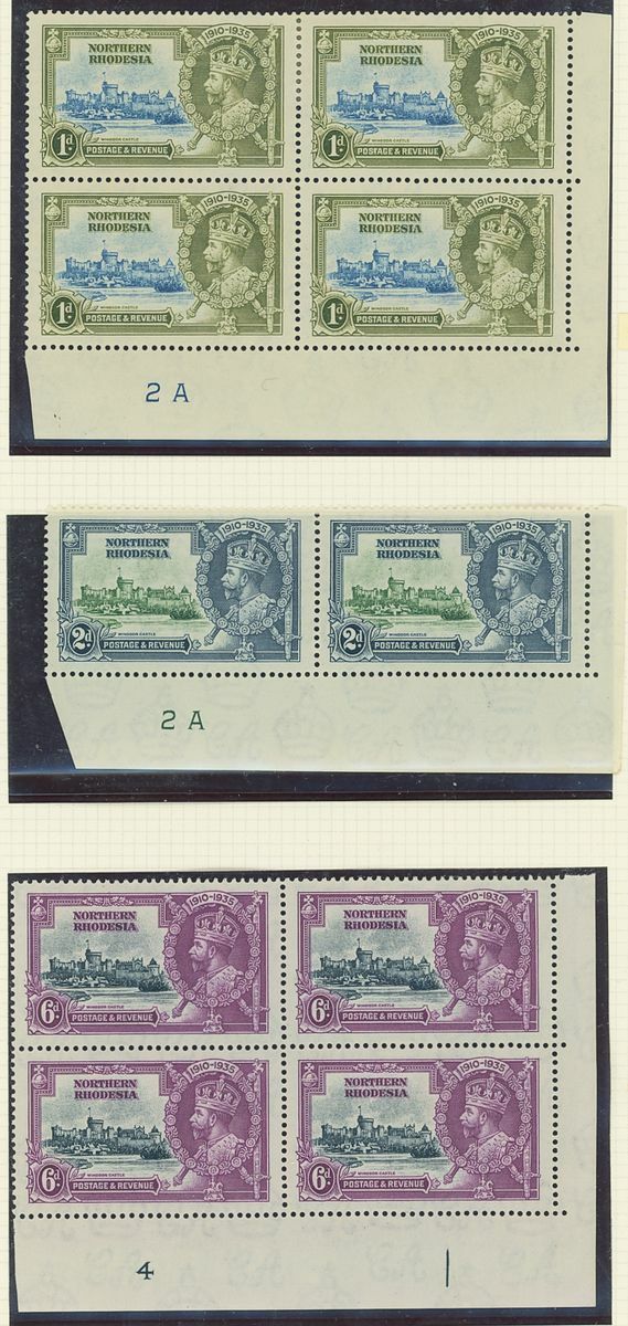 1935 Silver Jubilee collection of blocks and plate blocks on album pages including mint corner plate blocks of all values from various plates including plates 2a, 2b and 4, 1d., 2d. and 3d. blocks of twenty with plate and sheet numbers and showing minor frame flaws, larger blocks of ten and twelve of the 2d. value mint and used, 1d. plate 2A block of eight with minor frame varieties used by 'Mufulira' c.d.s, 3d. block of sixteen used by 'Mufulira' c.d.s. from plate 2B etyc. generally fine
