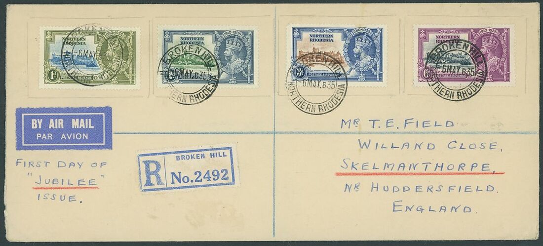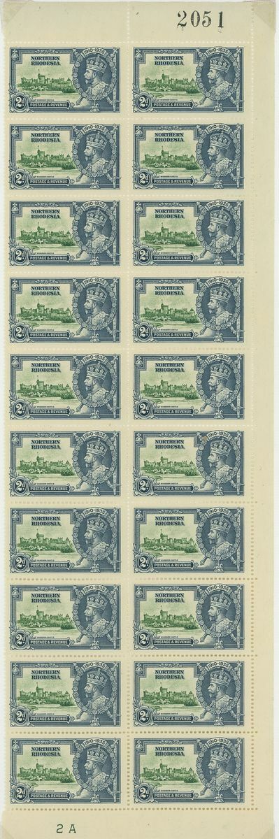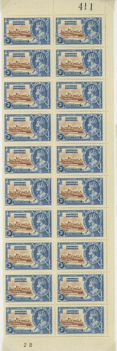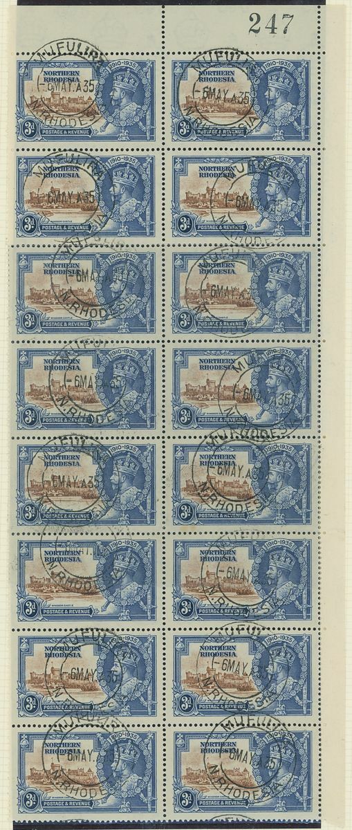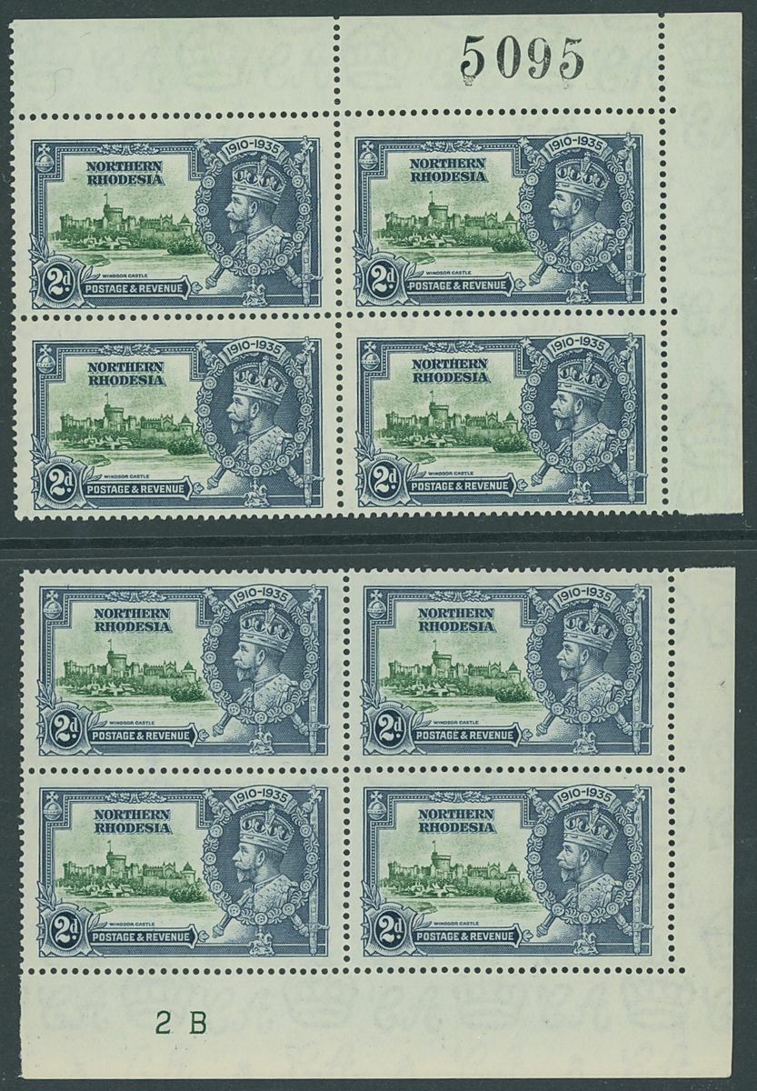 1935 Silver Jubilee collection of blocks and plate blocks on album pages including mint corner plate blocks of all values from various plates including plates 2a, 2b and 4, 1d., 2d. and 3d. blocks of twenty with plate and sheet numbers and showing minor frame flaws, larger blocks of ten and twelve of the 2d. value mint and used, 1d. plate 2A block of eight with minor frame varieties used by 'Mufulira' c.d.s, 3d. block of sixteen used by 'Mufulira' c.d.s. from plate 2B etyc. generally fine