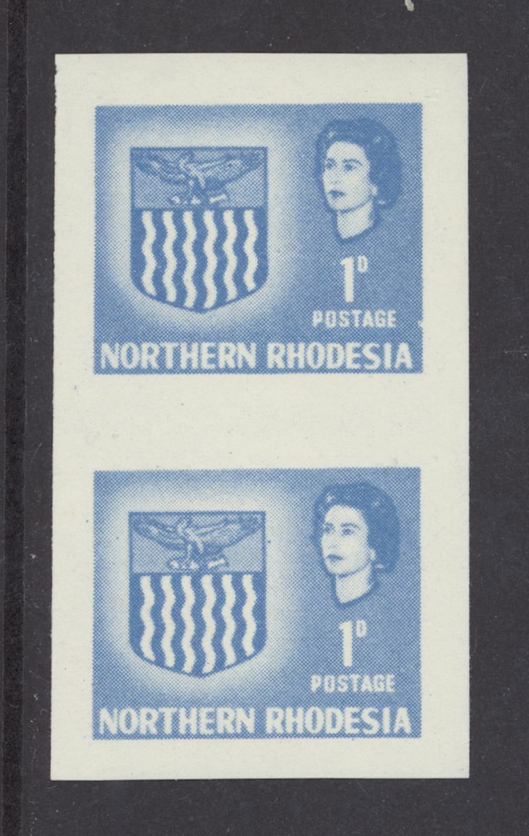1963 Arms Lusaka Trial Printing, 1d. pale grey-blue vertical pair on gummed wove paper, imperforate; fine and fresh unmounted mint