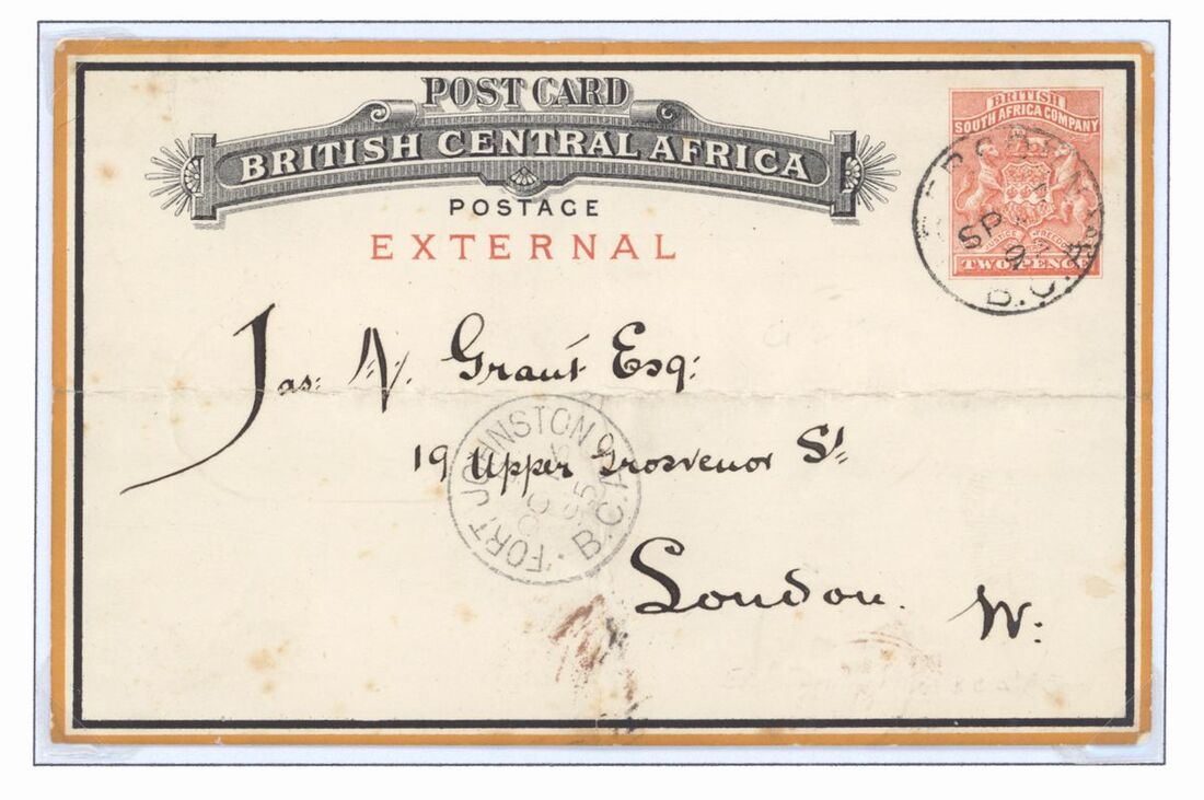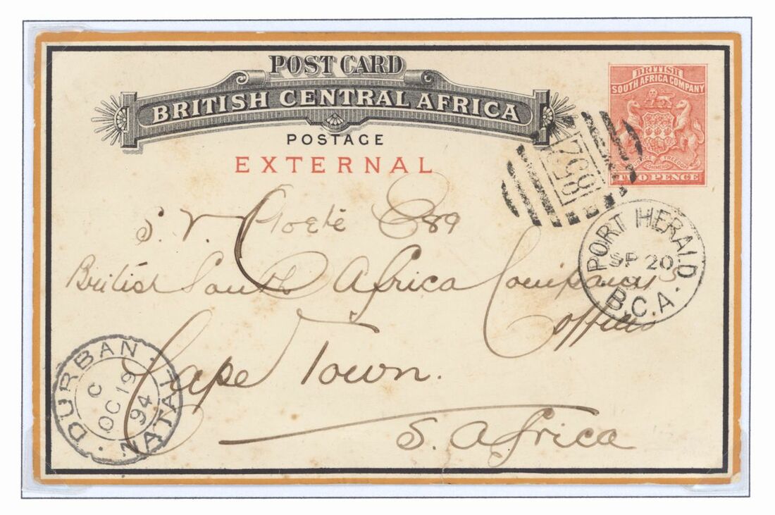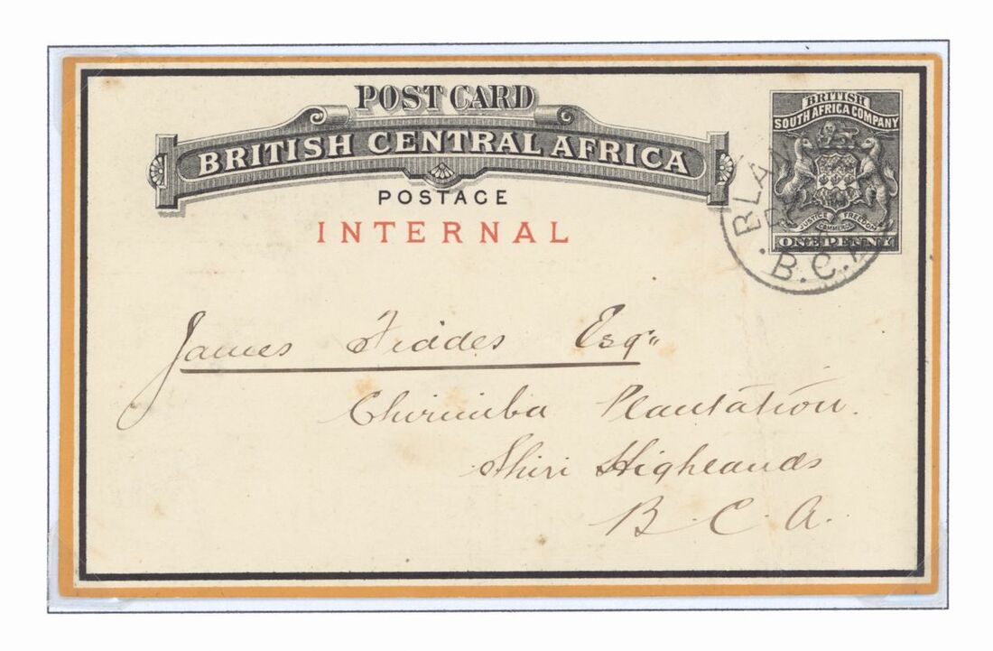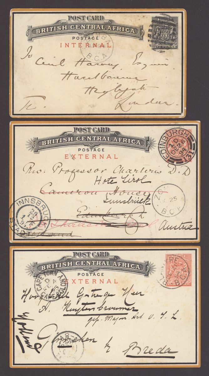 1894-5 post card group including 1st issue cards (7) 1d. internal (3) including Zomba to Captain Stewart in Fort Chikala, Zomba to London and calendar type from Blantyre to Shiri Highlands, 2d. external (4) including Port Herald to Cape Town via Durban with fine strike of Proud D2, locally addressed rare picture card illustrating alligators from Edinburgh, readdressed to Innsbruck, Austria and card headed "Tanganyika" from Abercorn to London cancelled by scarce Abercorn D2. Mixed condition, some with creasing though a good group with better marks.
