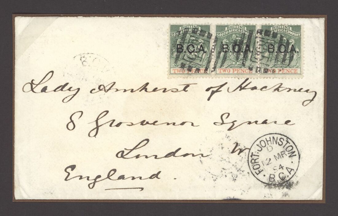 1894 (12 March) envelope to London bearing 2d. strip of three cancelled by 855 barred oval with Fort Johnston, Tshinde, Blantyre and London markings ex Amherst correspondence. Generally fine and scarce.