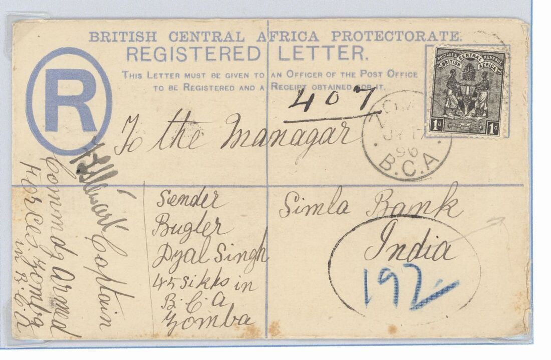 1896 (17 July) 4d. registered letter envelope from Bugler Sing, a solider in the 45 Sikhs in Zomba to Simla Bank India, uprated with Arms 1d. to pay soldier's letter rate black tied by Zomba (D2) and countersigned "Captain Commd of Armed Forces. Zomba in B.C.A."; handstruck oval with manuscript "192" on face and, on the reverse, Chinde (D3), Sea Post Office and Simla d.s. Small tear to flap on reverse otherwise fine and rare.