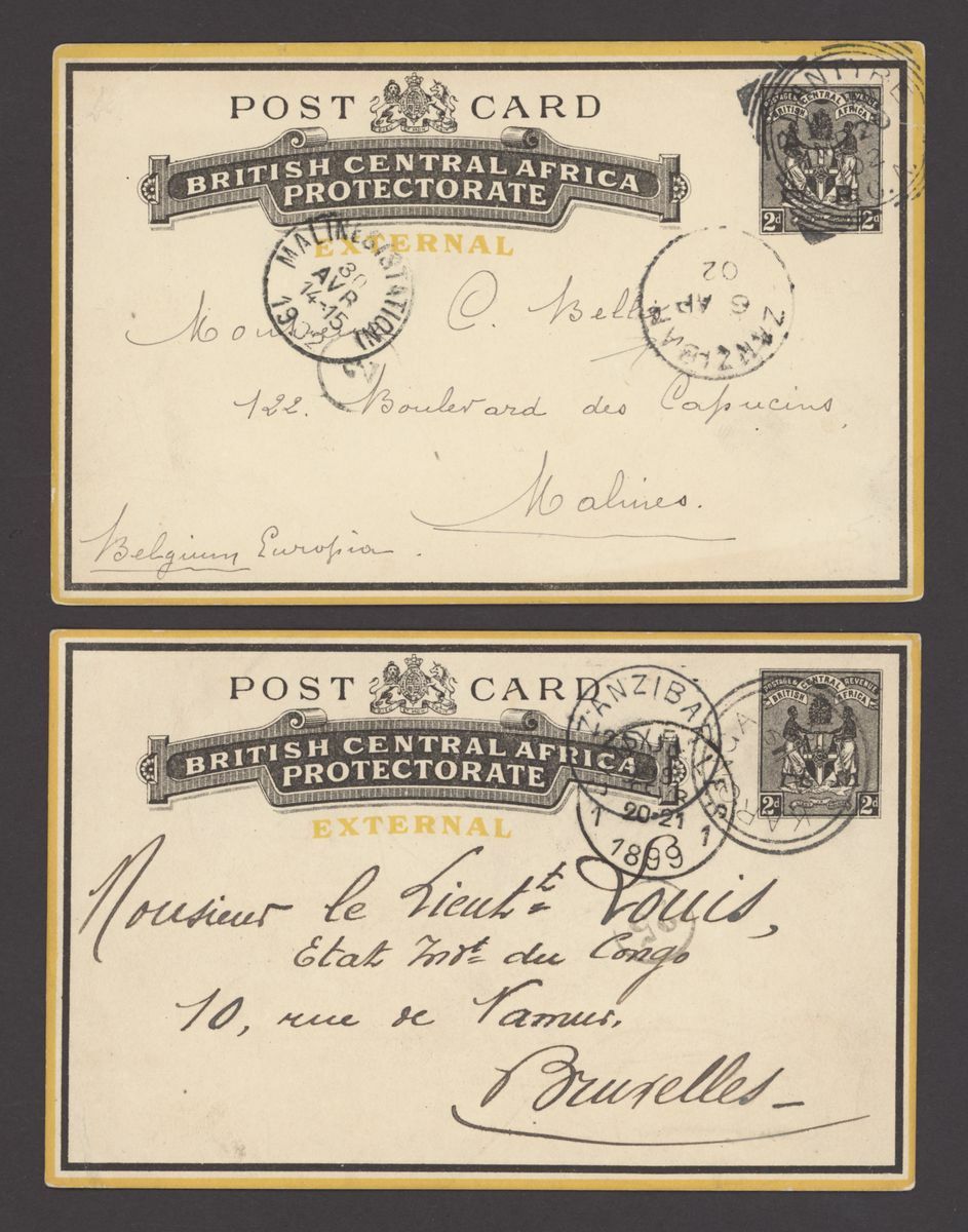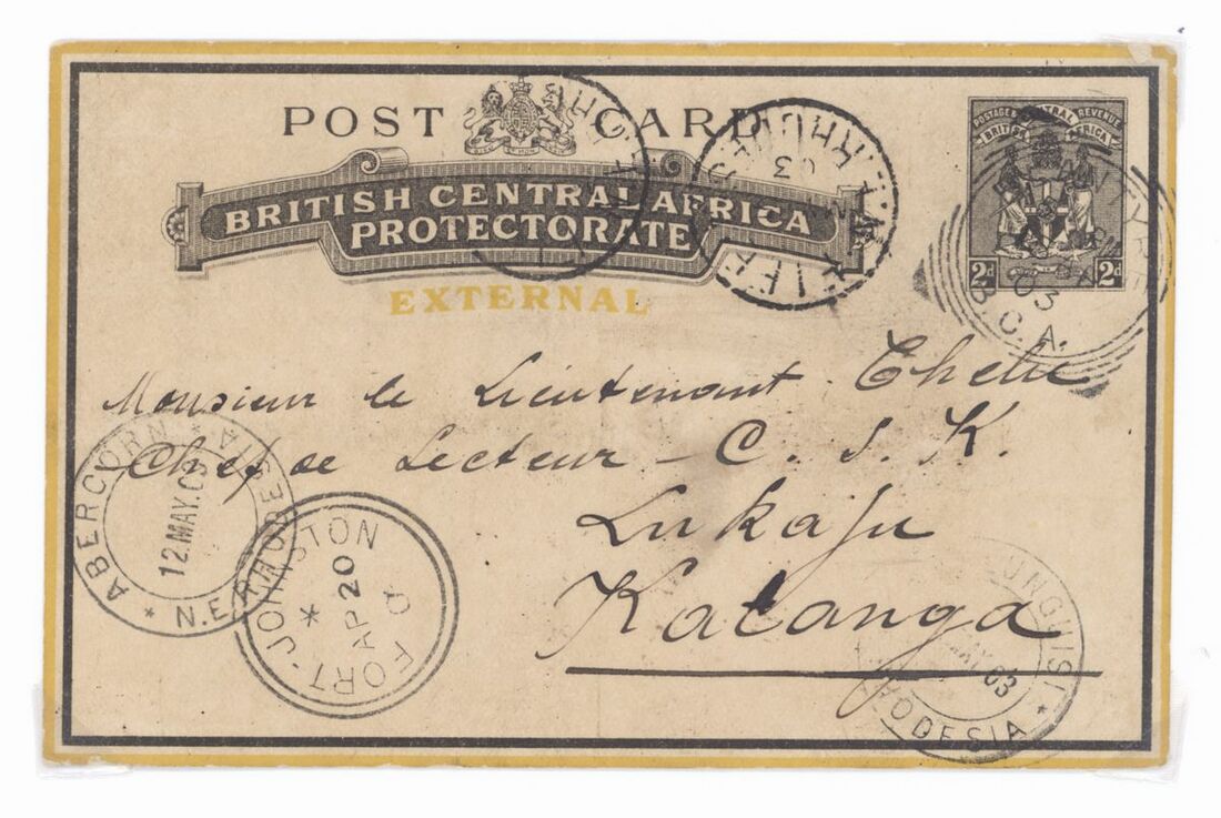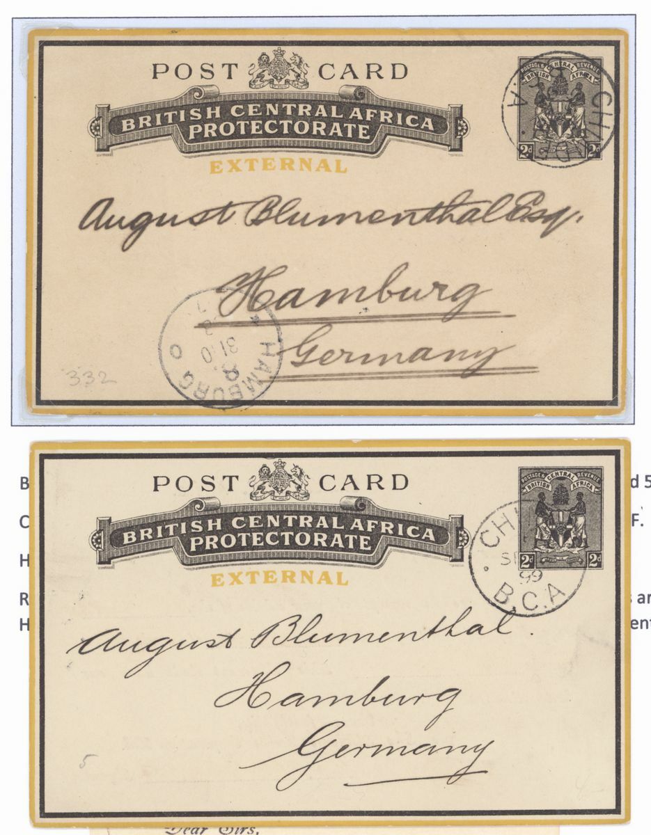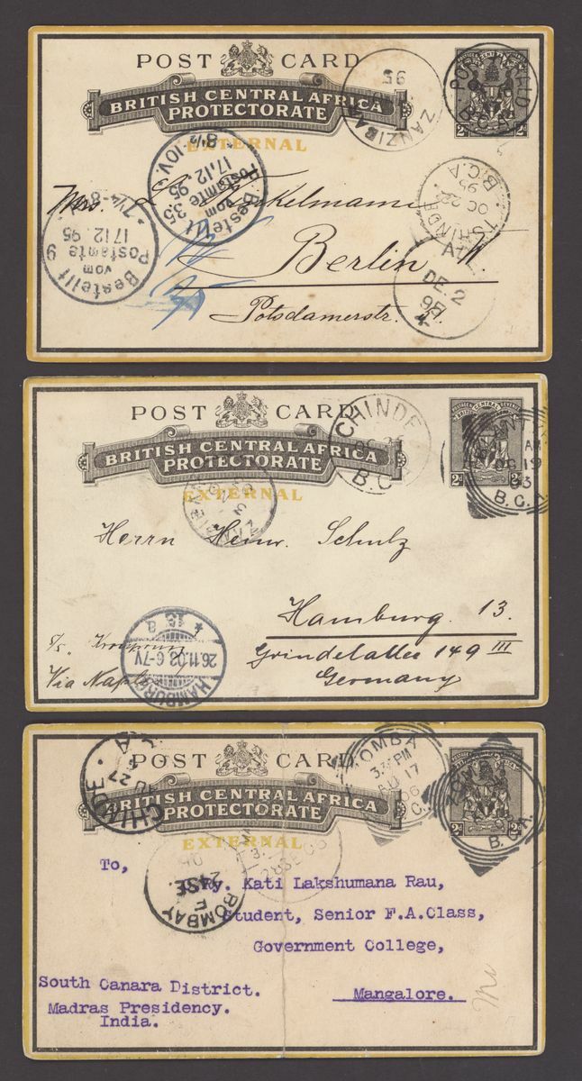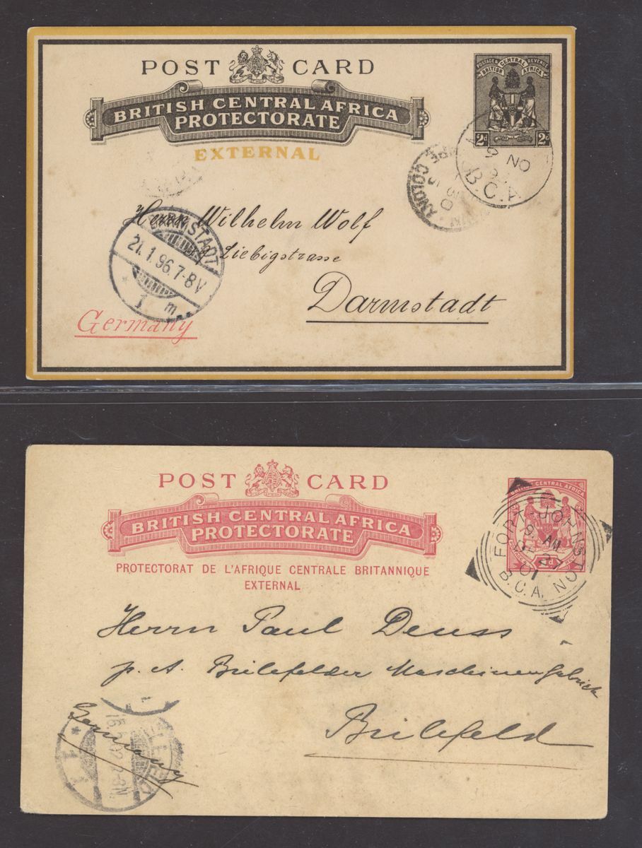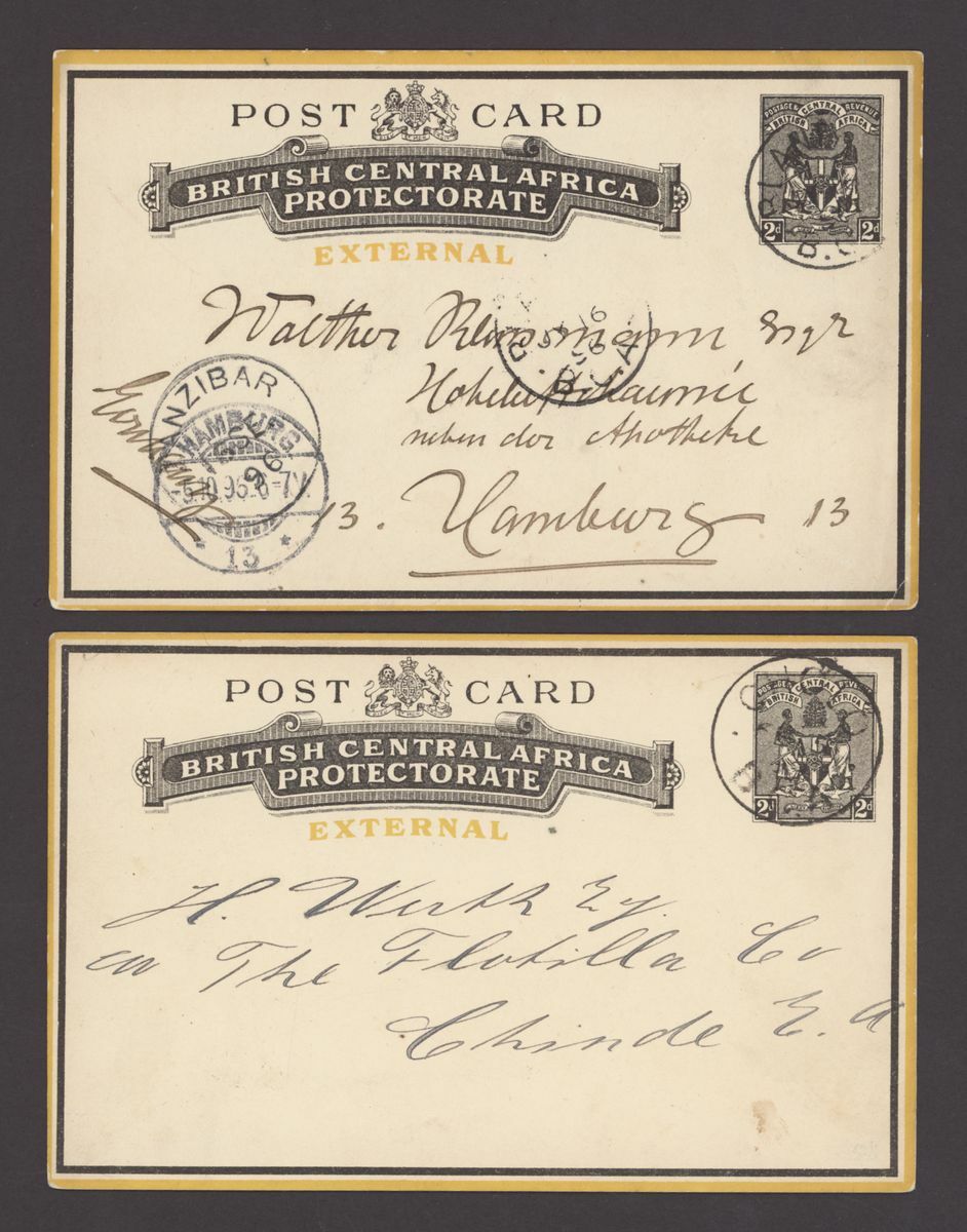 1898-1903 post card group comprising second type 2d. external cards (11) offices include Chinde (D3), Cholo (D1), Blantyre (D2, D3), Karonga (D2), Mlanje (D2), Port Herald, addresses include Berlin, Hamburg, Brussels, India, interesting card with picture pasted to reverse inscribed "A.T.T.G: I&S Office". Mixed condition though interesting.