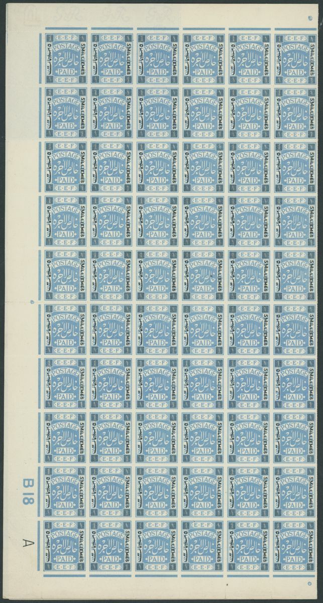1918 (16 Feb.) 5m. on 1p. cobalt-blue, almost complete sheet of one-hundred and fourteen (minus the upper right corner block of four showing the variety) with Control B 18A at lower left corner; fine, fresh and rare. S.G. 2, £13,300