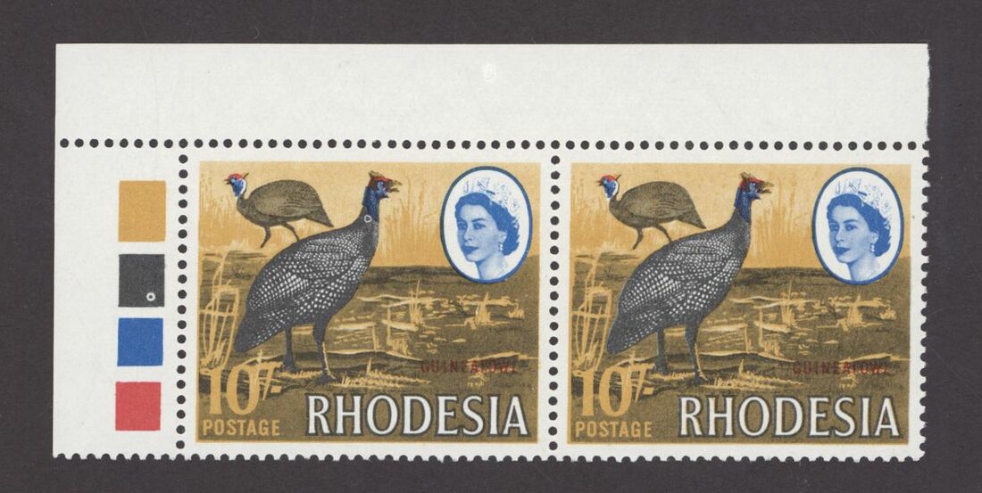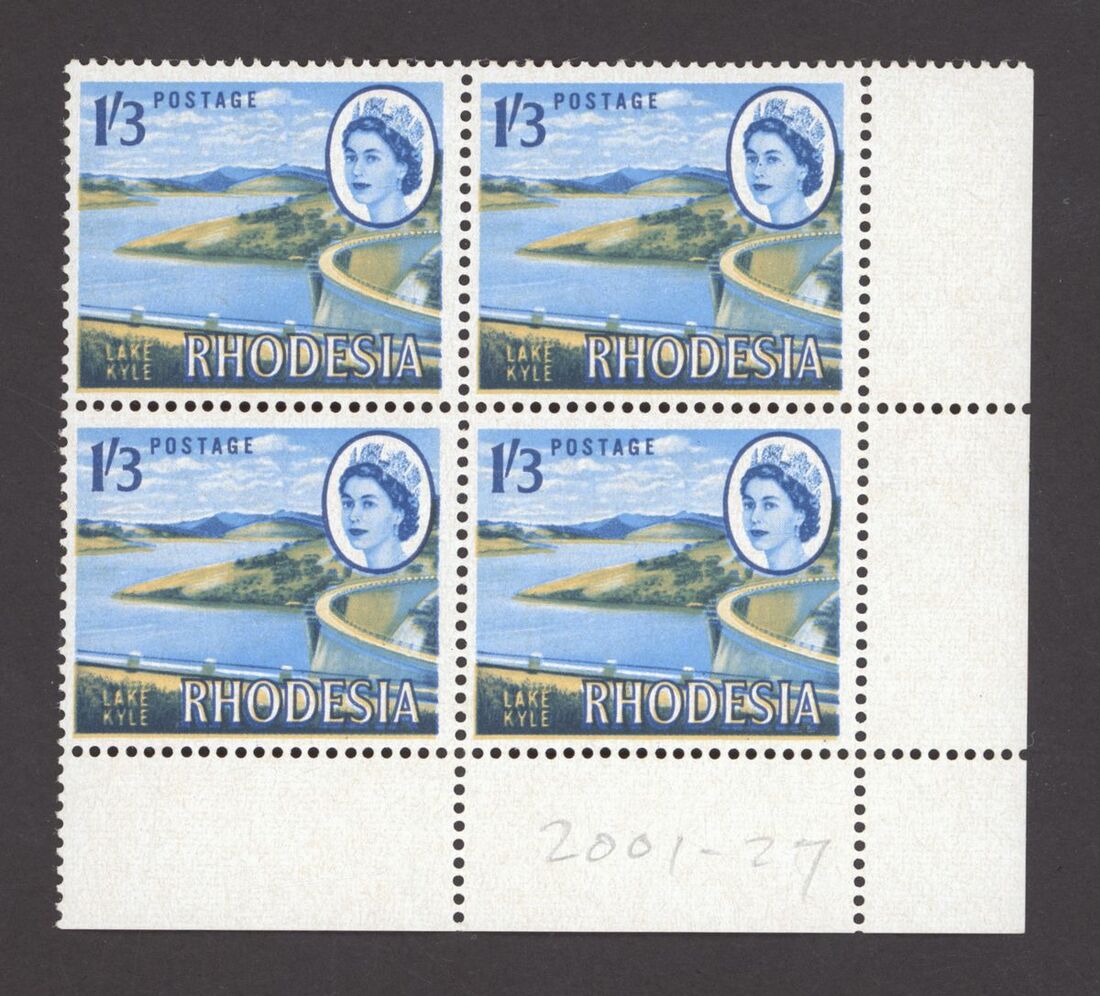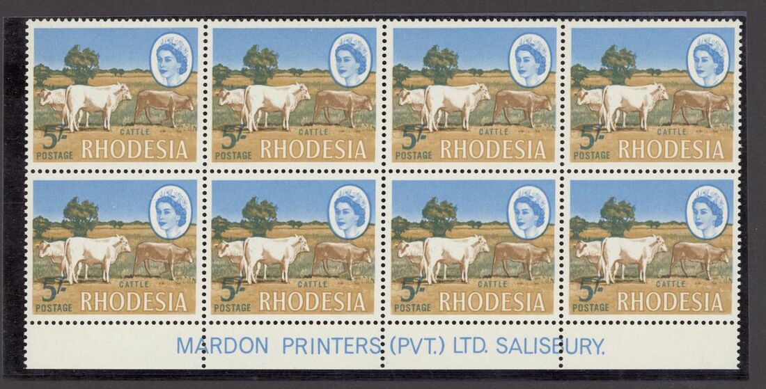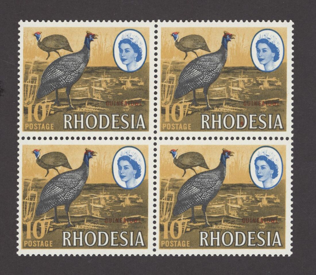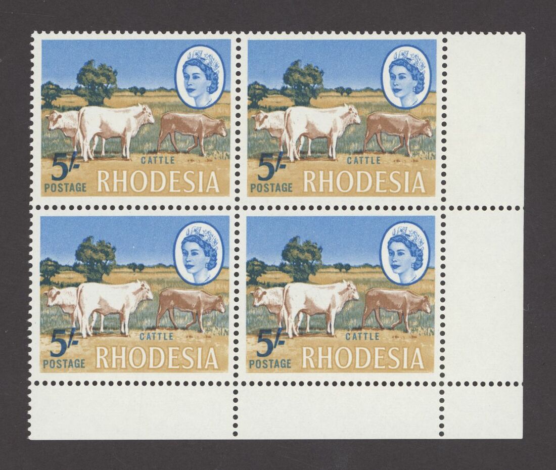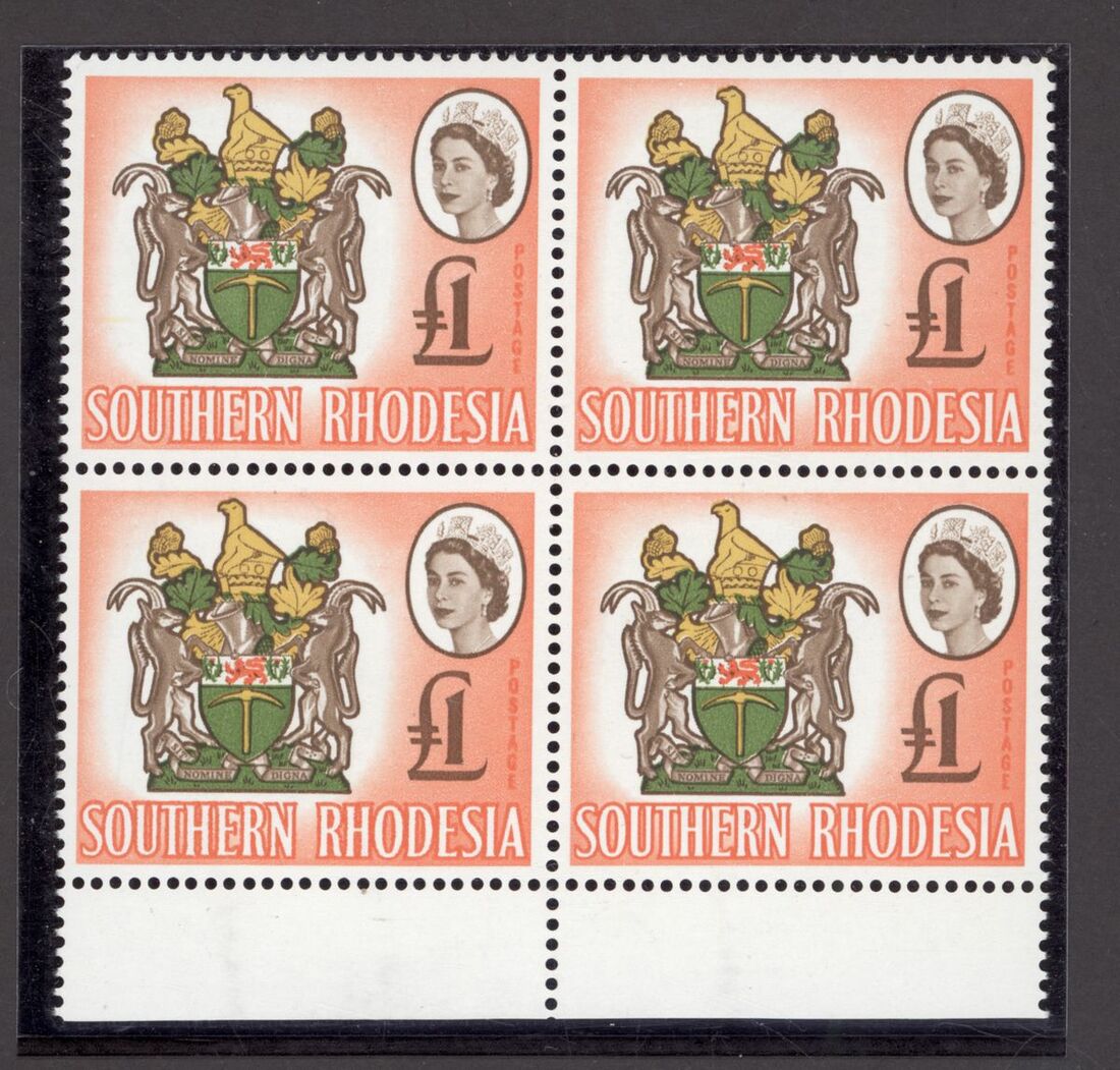 1966 (June) Mardon Trial printing group of mint multiples comprising blocks of four of the 6d., 1/3d., 5/- and 10/-, and also traffic light pairs of the 5/- and 10/- and an imprint block of eight of the 5/-; also Southern Rhodesia £1 block of four; generally fine and fresh