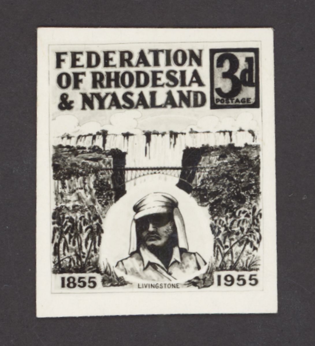 1955 Anniversary of Livingstone's Discovery of Victoria Falls archival photograph of an unaccepted 3d. design by V. E. Horne on thin card (32 x 38mm.); scarce