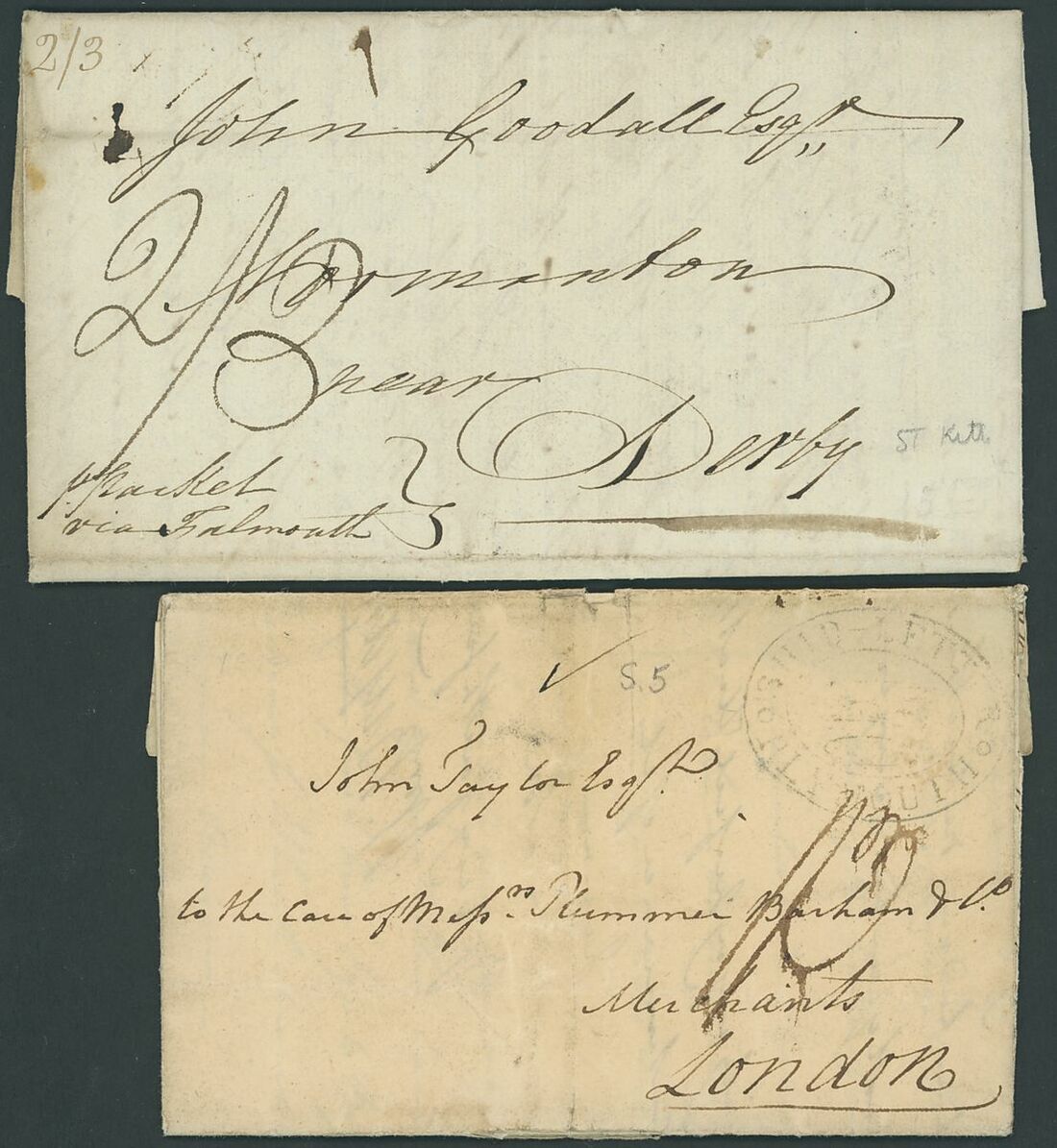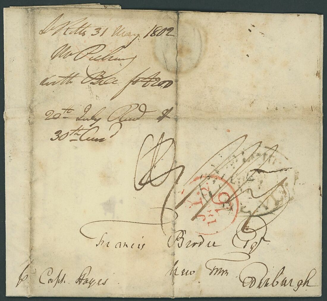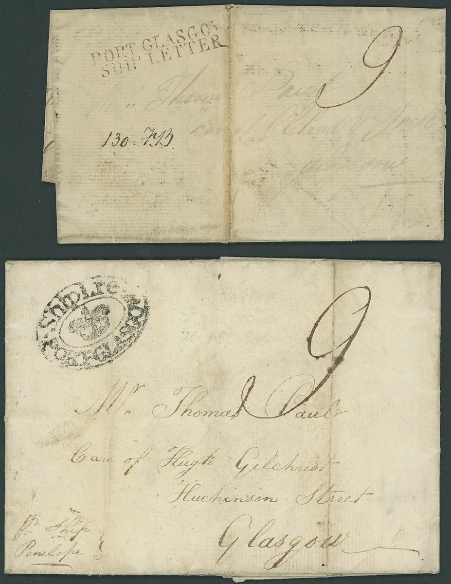 1802-34, five entire letters to the United Kingdom, including 1806 with good oval "Ship Lre/(Crown)/Port Glasgow", 1808 with fine "
