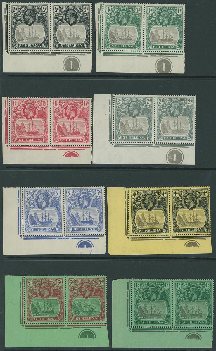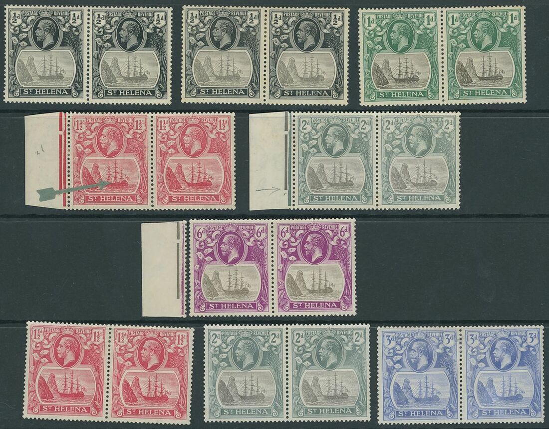 1922-37 Script ½d. (2), 1d., 1½d., 2d. and 6d., all variety broken mainmast variety, 1½d., 2d. and 3d. all torn flag variety, MCA 4d., Script ½d., 1d., 1½d., 2d., 3d., 5d. and 1/6d., all cleft rock variety, each in a horizontal pair with normal and mostly marginal examples, unmounted mint or large part original gum; chiefly fine. Cat. £2,600++