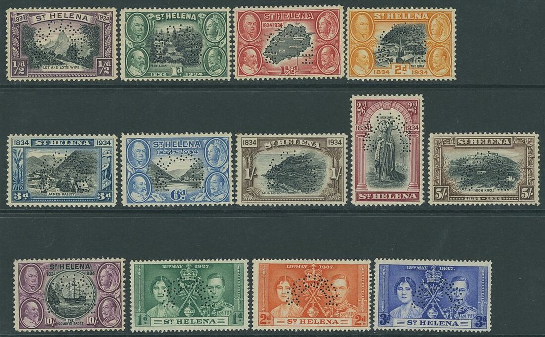 1934 Centenary set and 1937 Coronation set, each perforated "