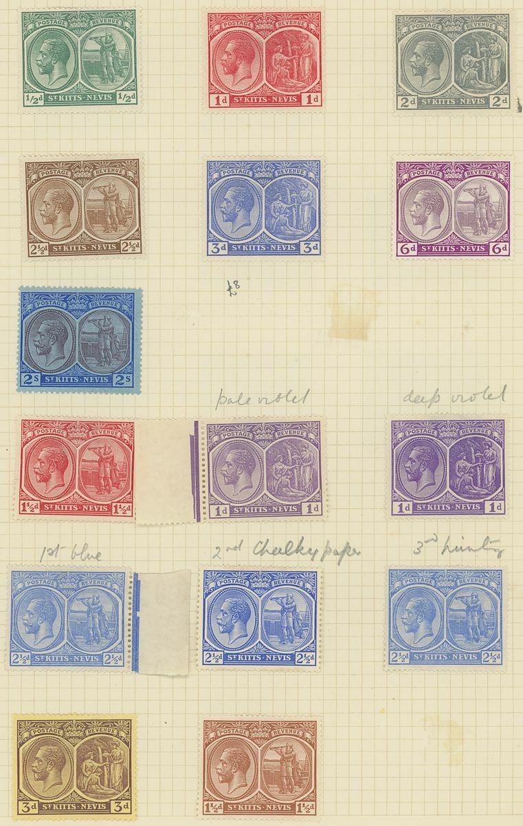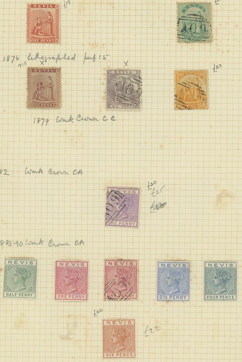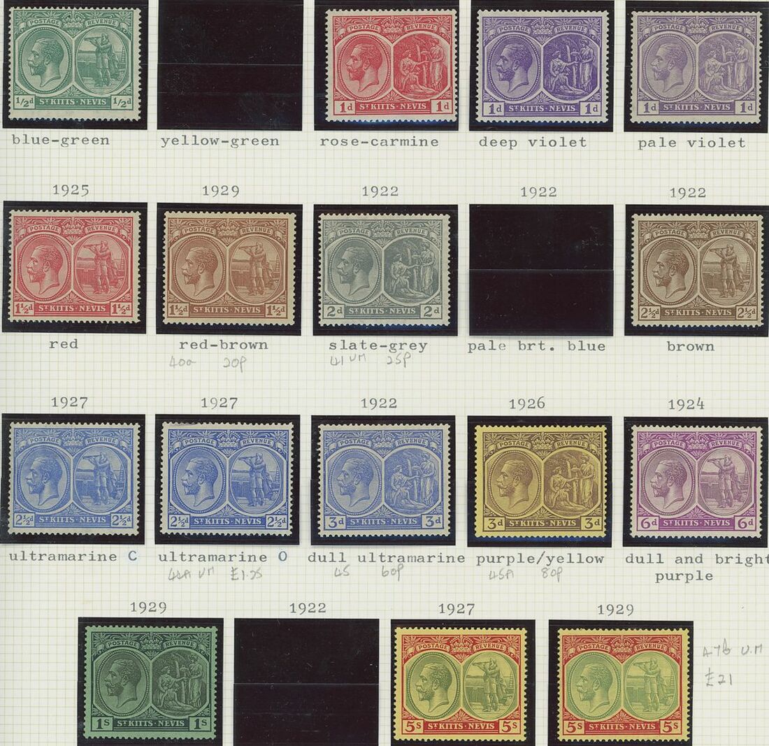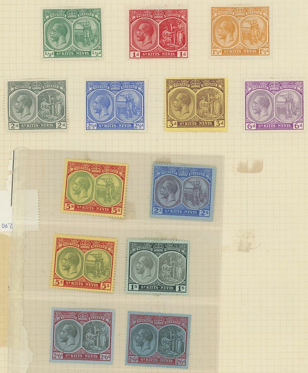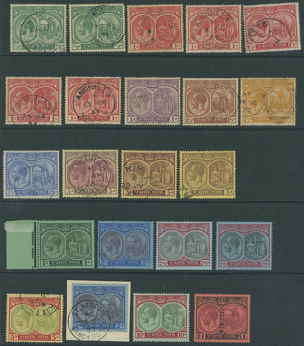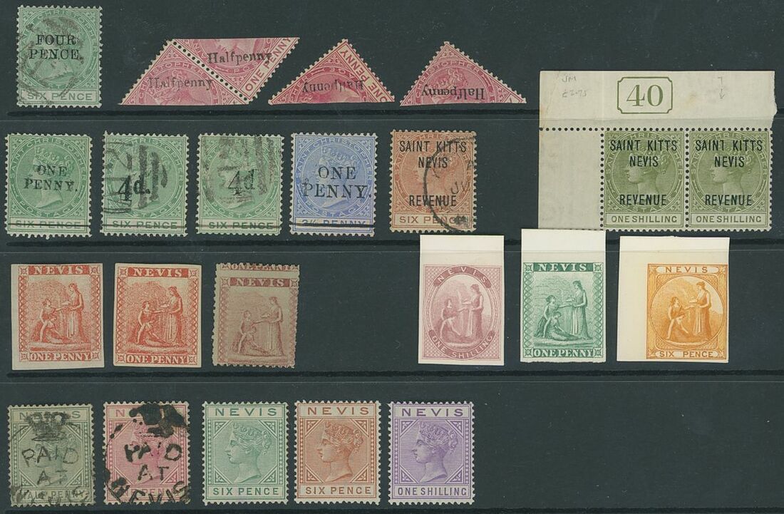 Mint and used selection (240+) on pages and stockpages, including St. Christopher 1870-82 perf. 14 4d. watermark inverted (unused and used), 1882-90 6d. and 1/- original gum, 1884 4d. on 6d., 1886 1d. on 6d. mint block of 12 (3x4), 4d. on 6d. (2), 1d. on 2½d., Nevis 1882-90 ½d. and 1d. with Crowned circle Paid/at/Nevis cancellations, 6d. green part original gum, 1/-, St. Kitts Nevis 1903 set original gum, 5/- sed, 1920-22 £1 overprinted "