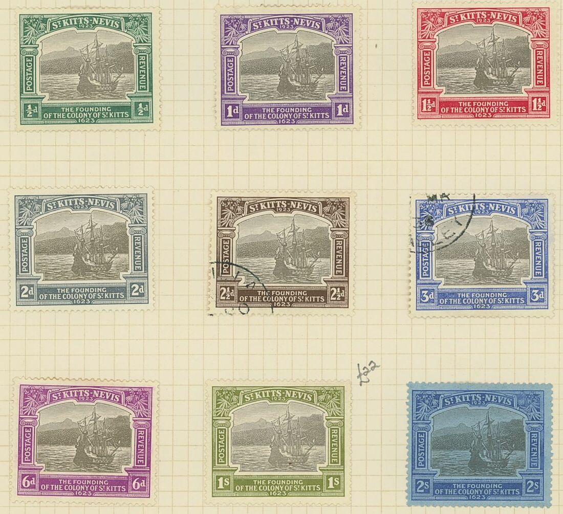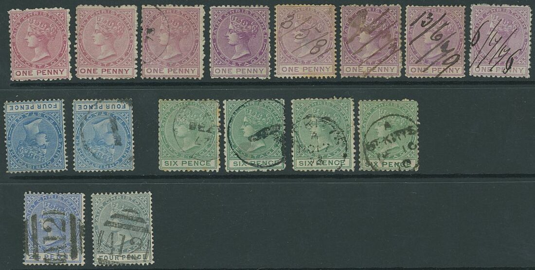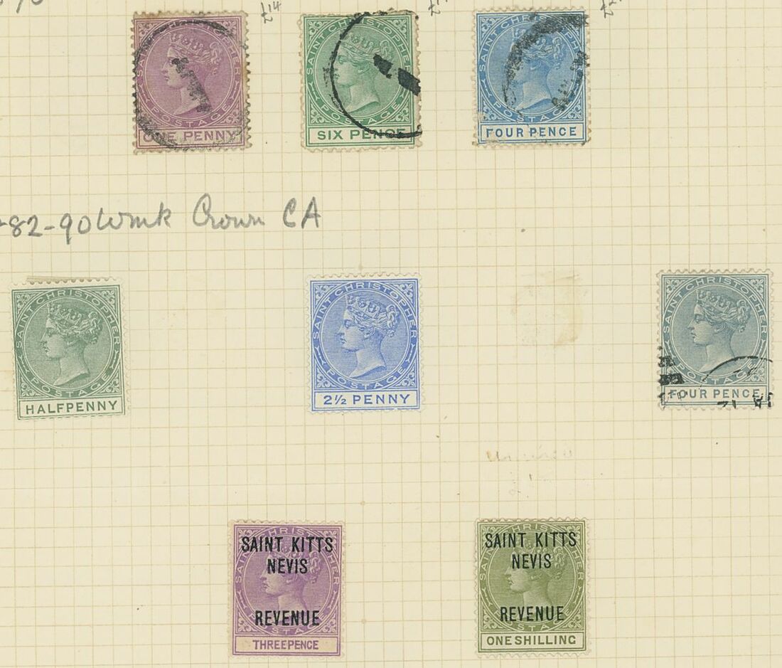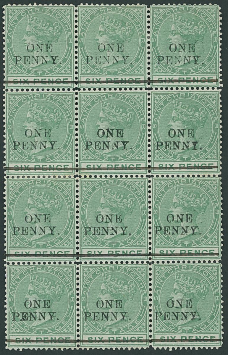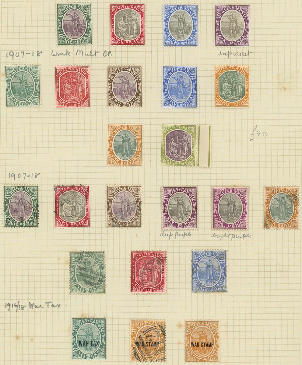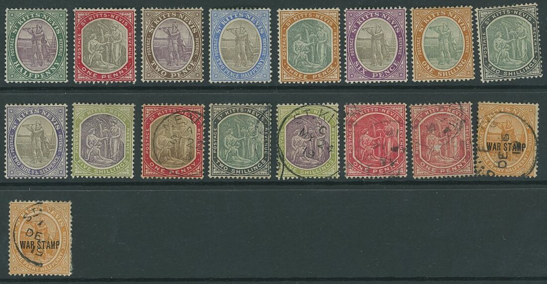Mint and used selection (240+) on pages and stockpages, including St. Christopher 1870-82 perf. 14 4d. watermark inverted (unused and used), 1882-90 6d. and 1/- original gum, 1884 4d. on 6d., 1886 1d. on 6d. mint block of 12 (3x4), 4d. on 6d. (2), 1d. on 2½d., Nevis 1882-90 ½d. and 1d. with Crowned circle Paid/at/Nevis cancellations, 6d. green part original gum, 1/-, St. Kitts Nevis 1903 set original gum, 5/- sed, 1920-22 £1 overprinted "