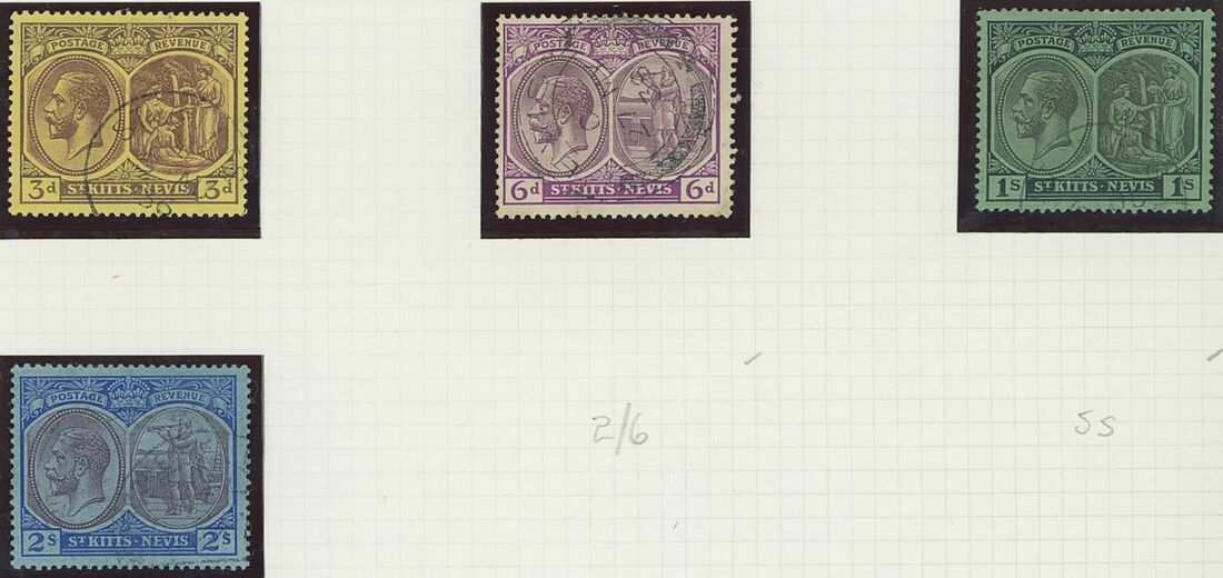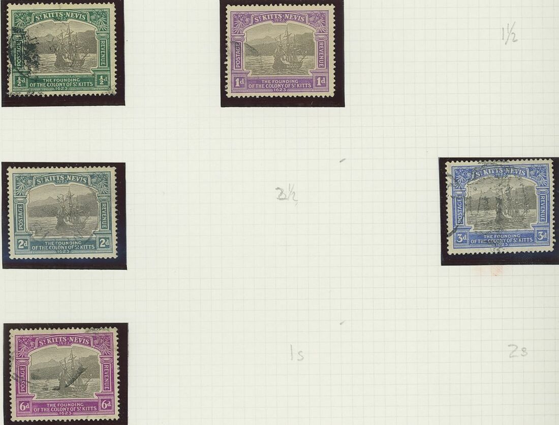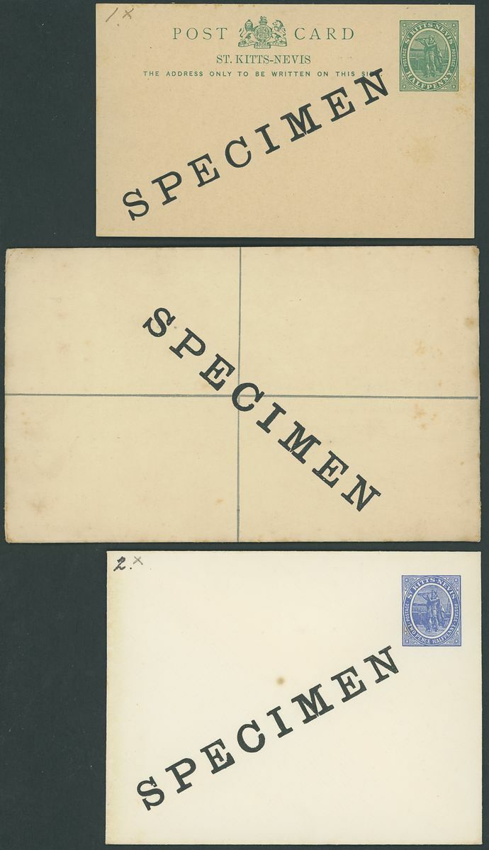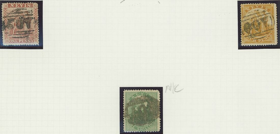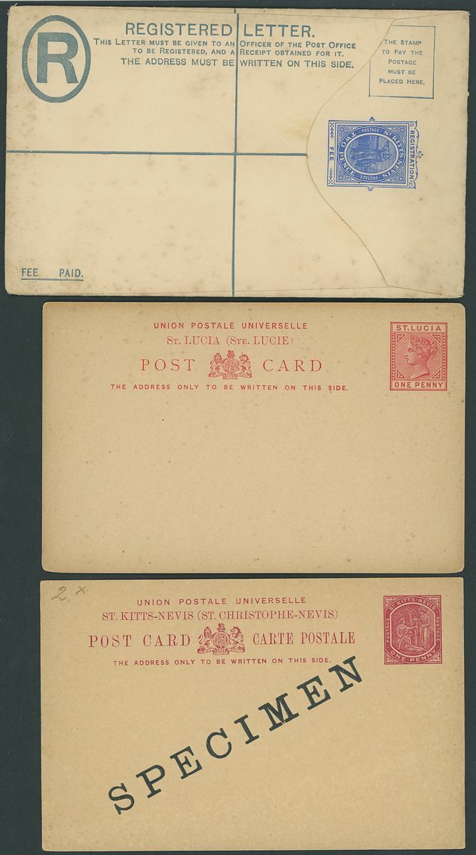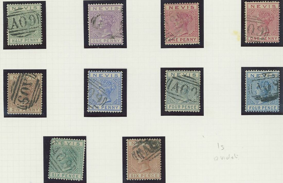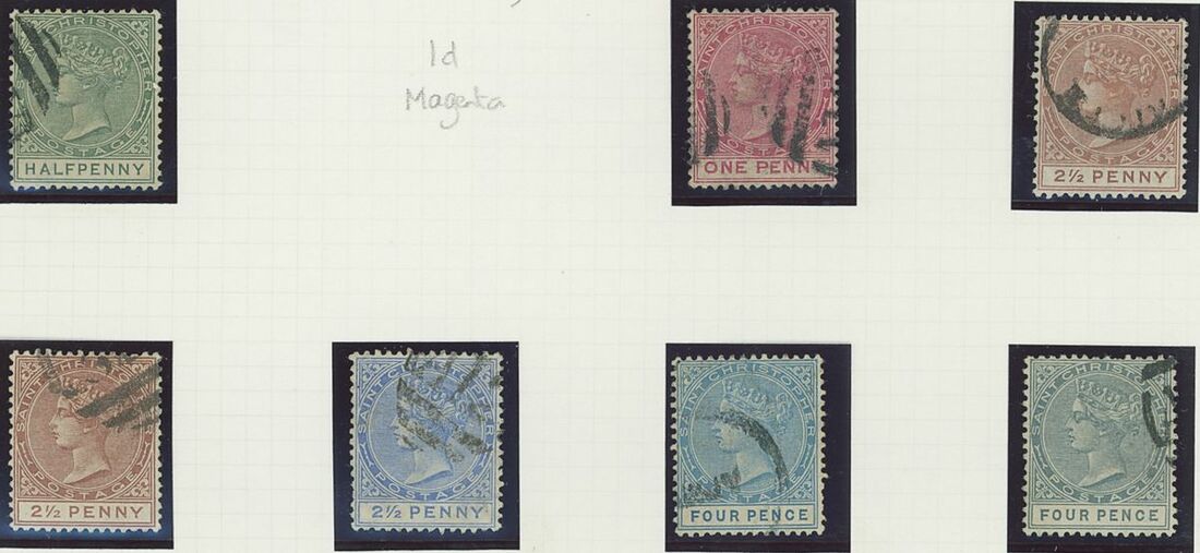 Used selection on pages, including St. Christopher 1882-90 2½d. red-brown (2), 1884 4d. on 6d., 1885 "Halfpenny" on half 1d., 1886 4d. on 6d., Nevis 1882-90 2½d. red-brown, 6d. green, 6d. chestnut, St. Kitts Nevis 1920-22 10/-, 1930 cover to Washington franked 1d., 2d. and Leeward ½d., Postal stationery (unused or overprinted "