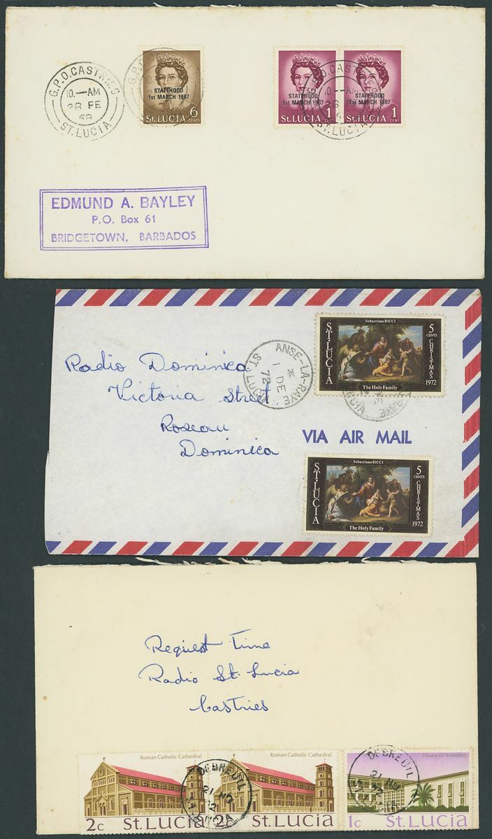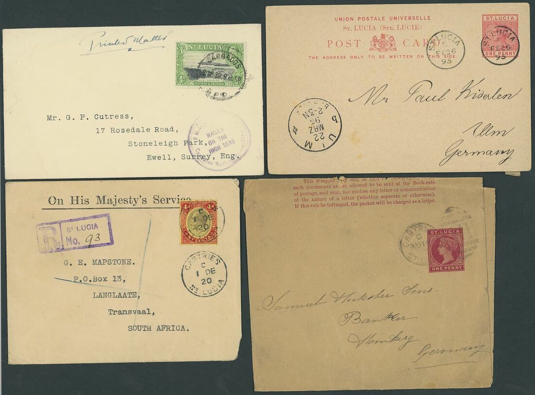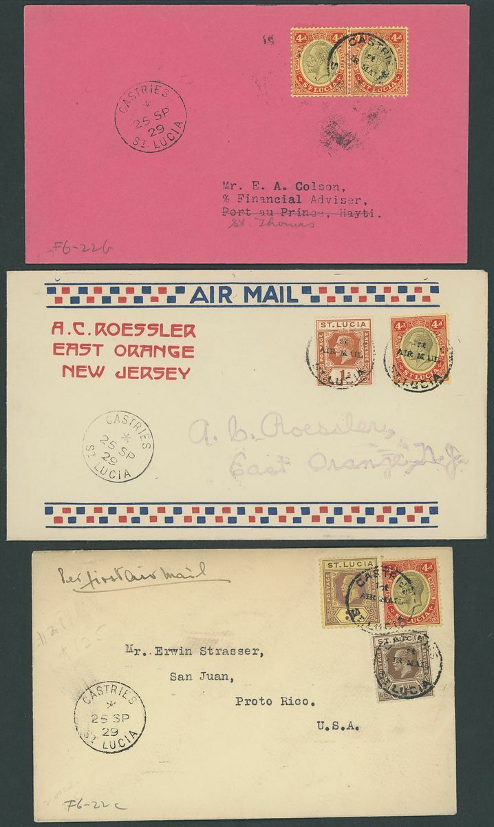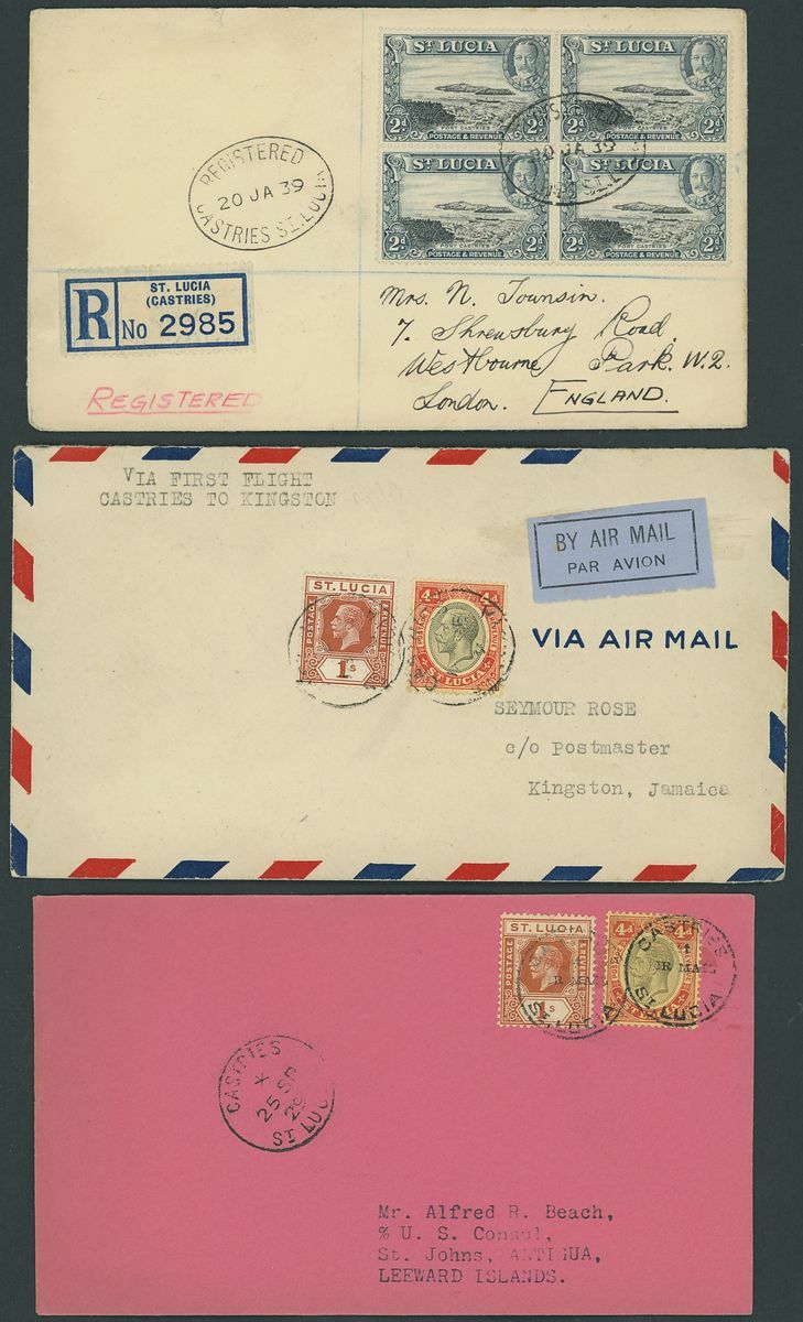 1884-1973, selection of forty-three covers and cards, including 1929 (Sept.) Air Mail covers to Porto Rico, East Orange and St. Thomas, 1931 (Jan.) Guyana to Guadeloupe first flight cover with Castries transit on the reverse, 1939 cover Registered to London franked 1936 2d. block of four, later issues, postal stationery, etc., mixed condition