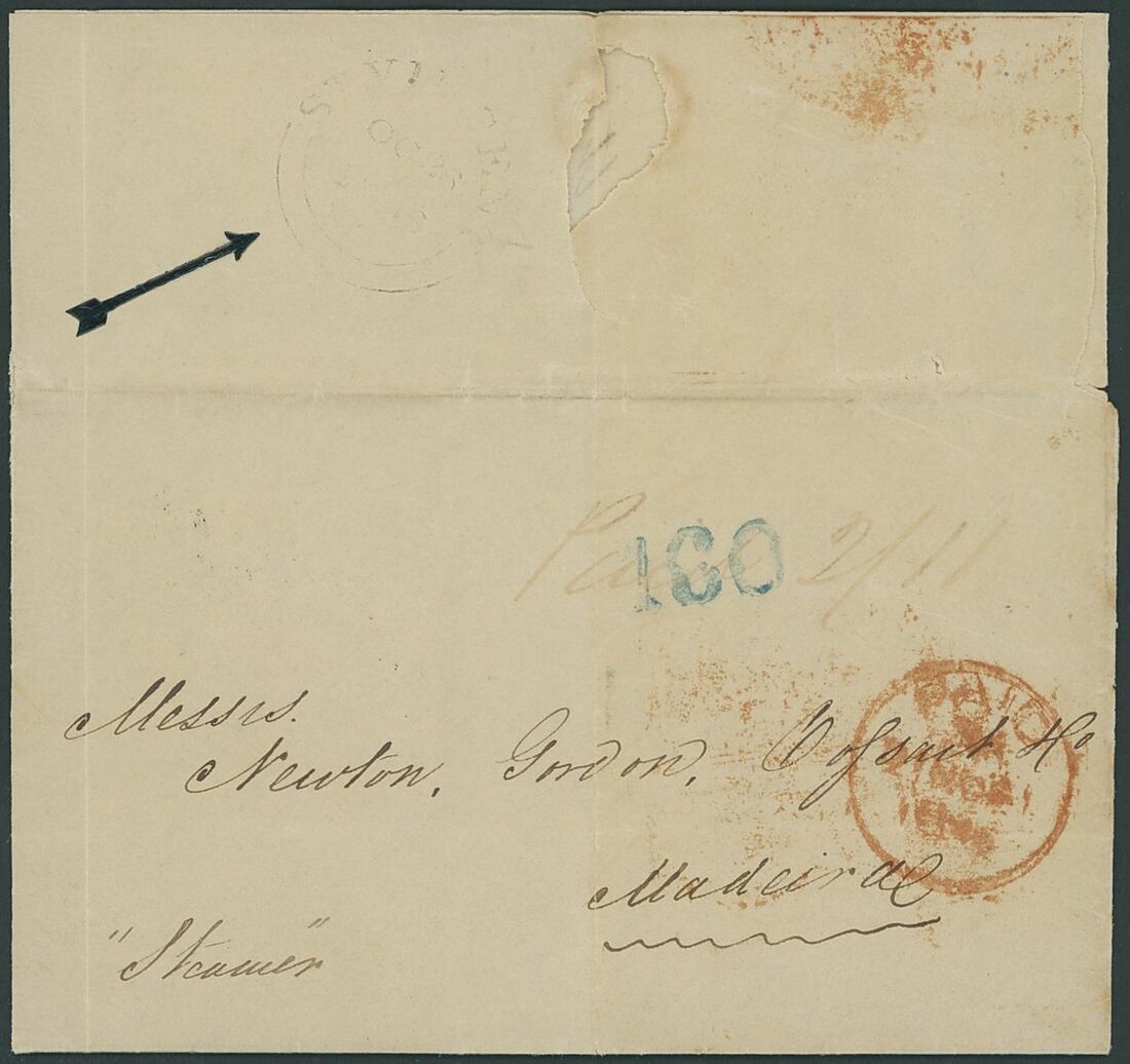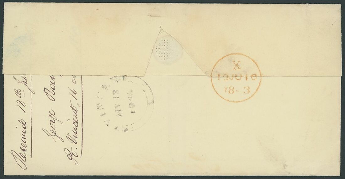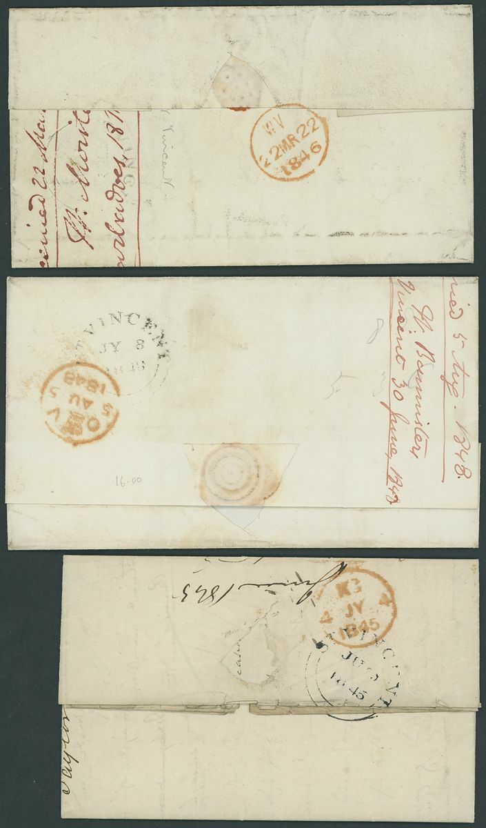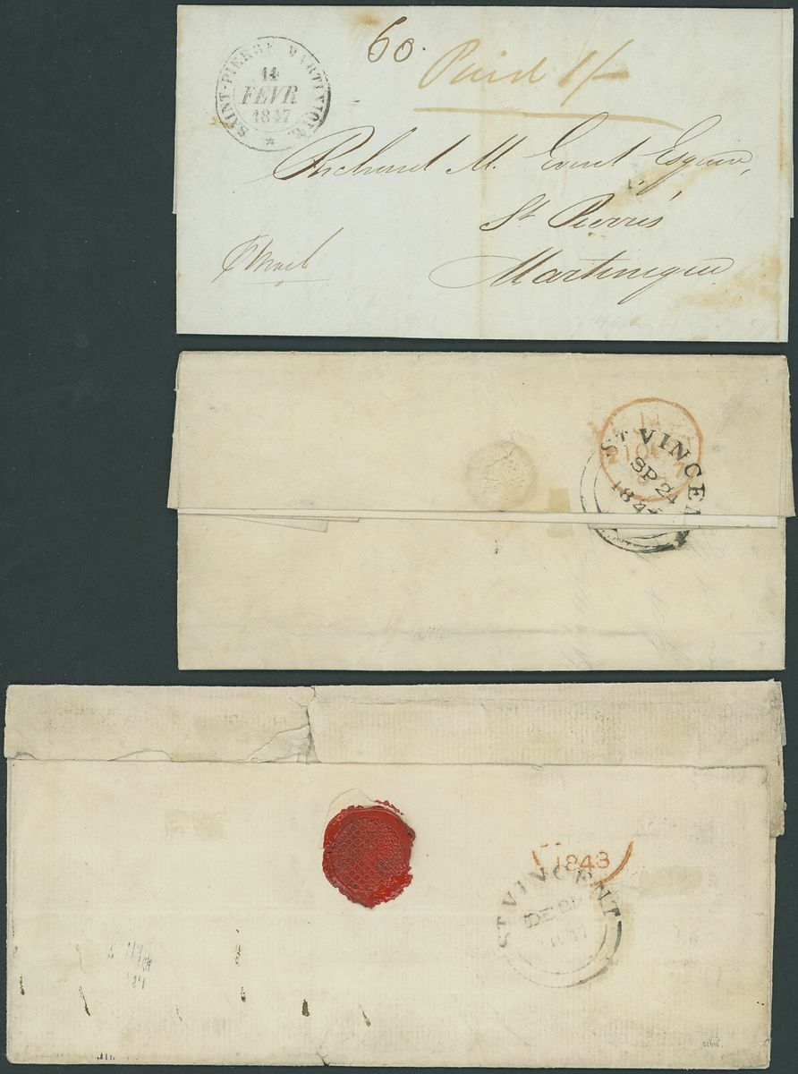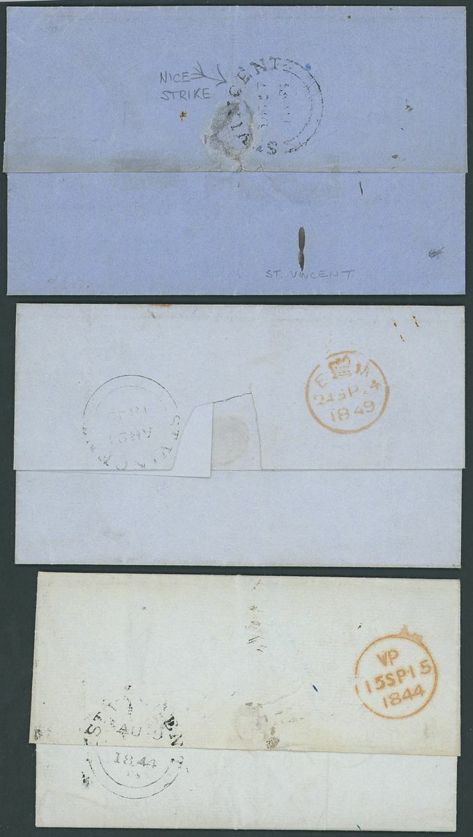 1844-55 entire letters (9), entires (9) and envelopes (2), one addressed to Madeira, one to Martinique, the rest to UK (mostly London), all showing St. Vincent double-arc d.s. with strikes from very poor to superb, one is struck in red, the majority are rated "1/-", condition rather mixed
