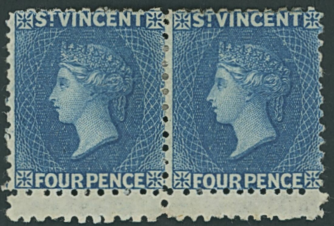 1863-68 no watermark, perf 11 to 12½ 4d. deep blue horizontal pair showing double perforations at foot, fine unused with part original gum. S.G. 6