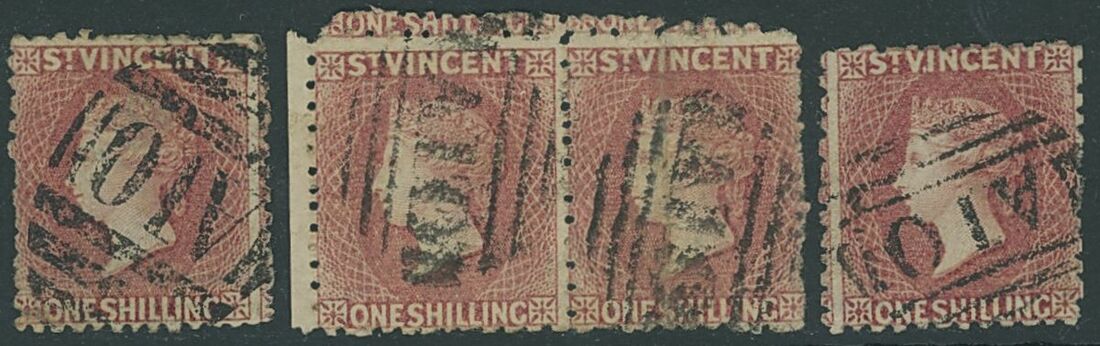 1871 wmk. Small Star, rough perf 14 to 16 1/- deep rose-red, a horizontal pair showing large part double perforations at top, and two singles, all cancelled "A10", one with some shortish perfs otherwise fine. S.G. 17, £560+
