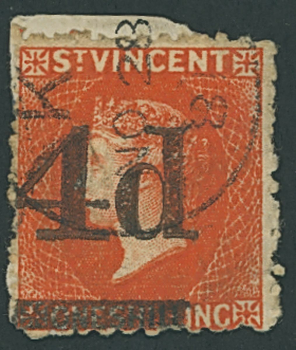 1881 (Nov.) "4d" on 1/- bright vermilion possibly from a trial printing with short bar at right, cancelled by "K" abbreviated datestamp for 28 November, fine. S.G. 35, £800