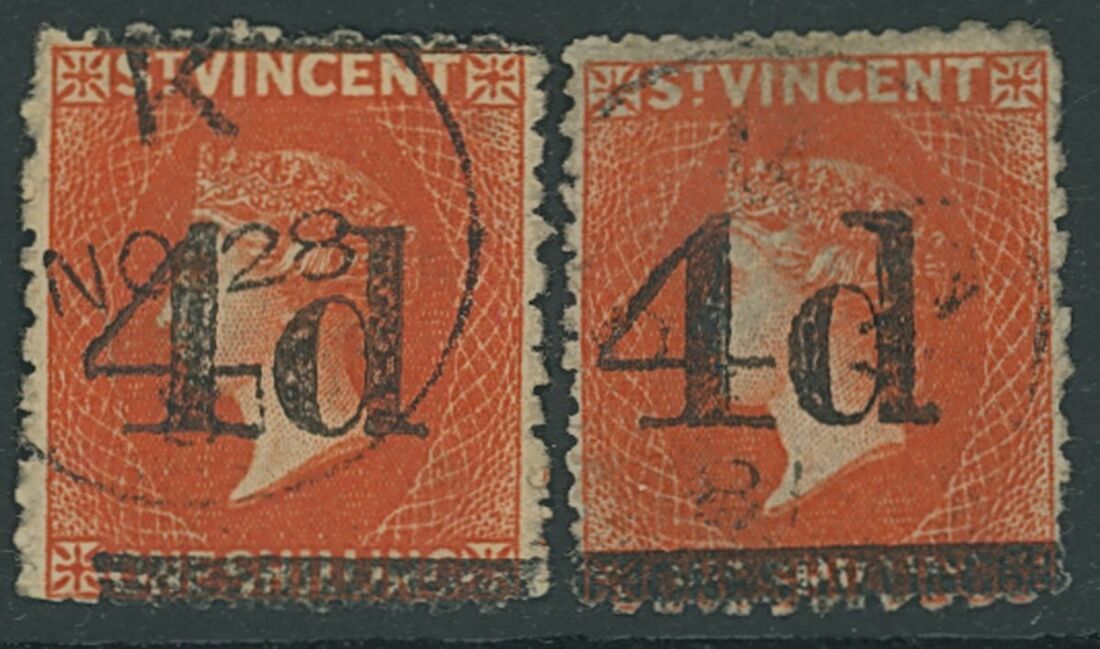 1881 4d. on 1/- bright vermilion, two examples neatly cancelled by "K" abbreviated datestamp, one with short bar at left, the other with small central thin. S.G. 35, £1,600