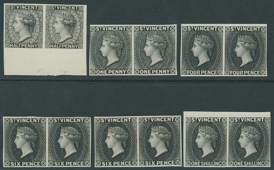 1882 1d., 4d. and 1883-84 ½d., 6d. (2) and 1/- imperforate De La Rue plate proof pairs on wove paper, fine