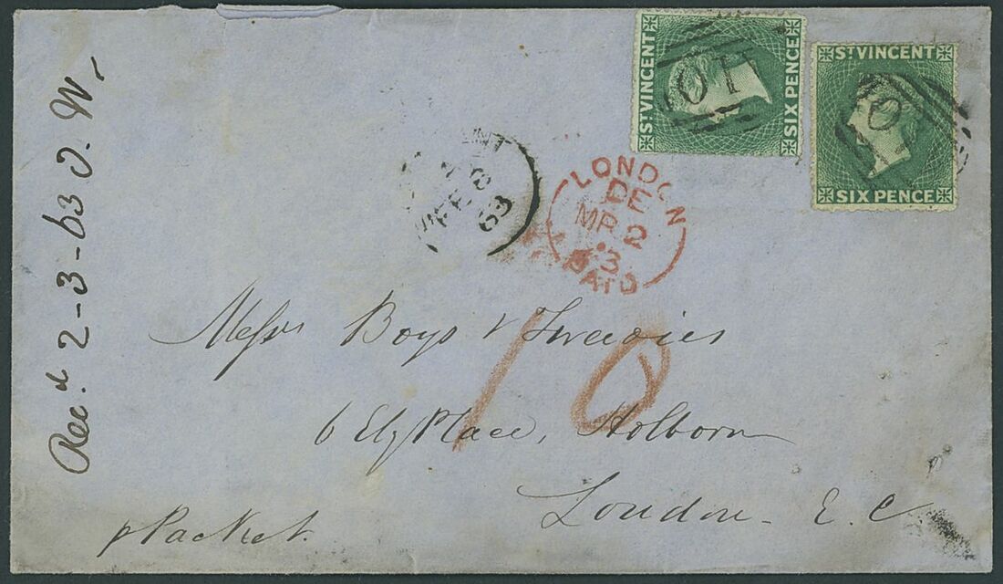1863 (8 Feb.) double rate envelope to London, bearing 1862 (Sept.) 6d. deep green (2) cancelled "A10", showing red crayon "10", poor St. Vincent c.d.s. in black and red London Paid arrival d.s. (2.3); the envelope with pinholes at right. S.G. 4