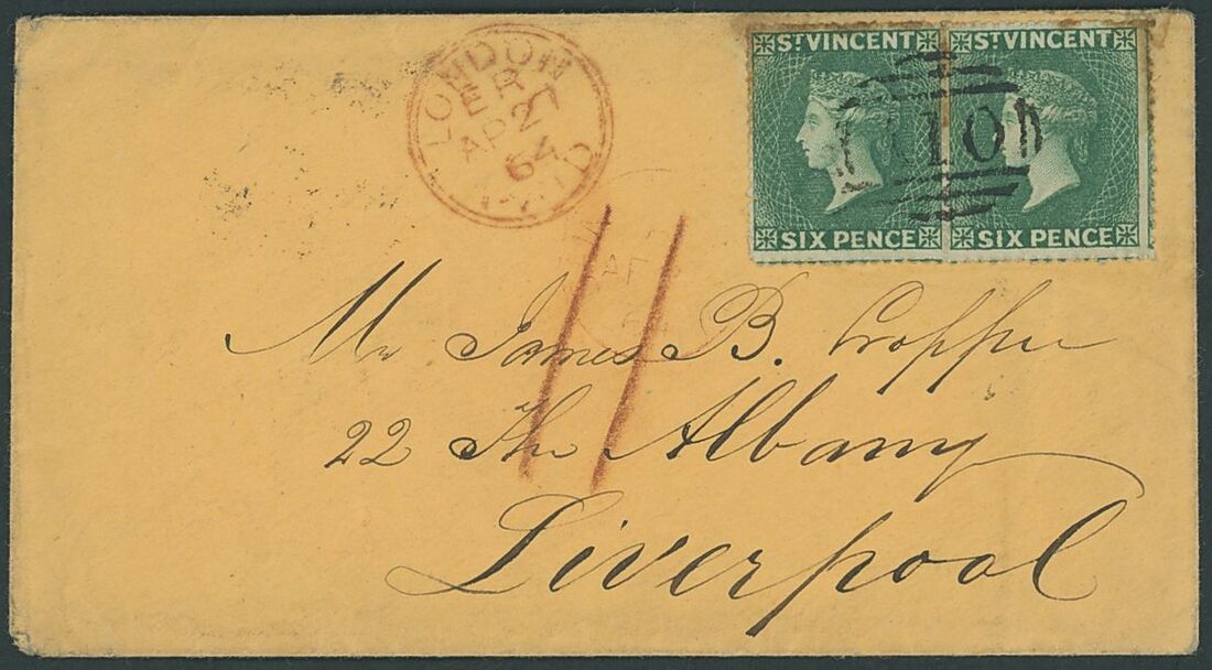 1864 (Apr.) double rate envelope to Liverpool, bearing 1862 (Sept.) 6d. deep green pair sharing "A10" obliterator, showing red crayon "11", St. Vincent and London Paid (27.4) datestamps, both in red, with clear arrival c.d.s. on reverse; some staining around adhesives. S.G. 6