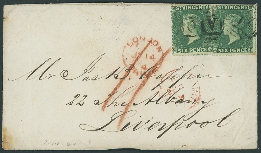 1864 (23 June) double rate envelope to Liverpool, bearing 1862 (Sept.) 6d. deep green (2) cancelled "A10", showing red crayon "11", St. Vincent and London (14.7) datestamps in red with arrival c.d.s. on reverse. S.G. 4