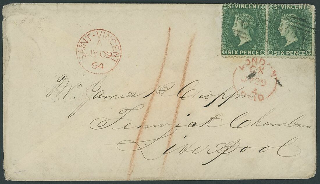 1864 (9 July) double rate envelope to Liverpool, bearing 1862 (Sept.) 6d. deep green pair lightly cancelled "A10", showing red crayon "11", St. Vincent and London Paid (29.7) datestamps in red with arrival c.d.s. on reverse; the envelope a little soiled and with some peripheral faults. Robson Lowe Certificate of Opinion (1970). S.G. 4