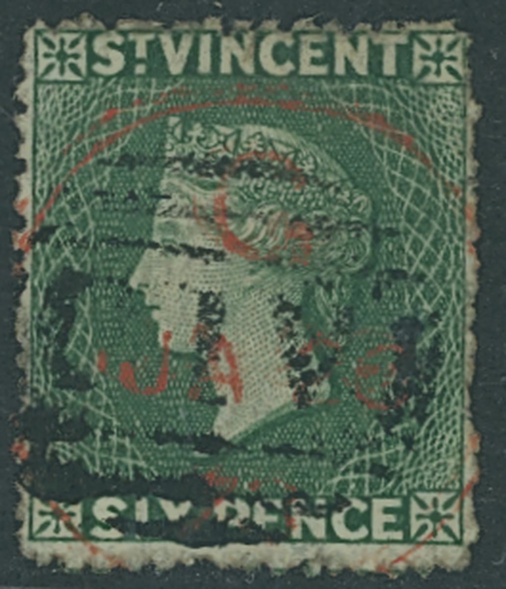 1871 6d. deep green with almost complete "G" strike in red dated 26 January 1873 and overstruck "A10"; some perforation faults at right otherwise fine. Rare.