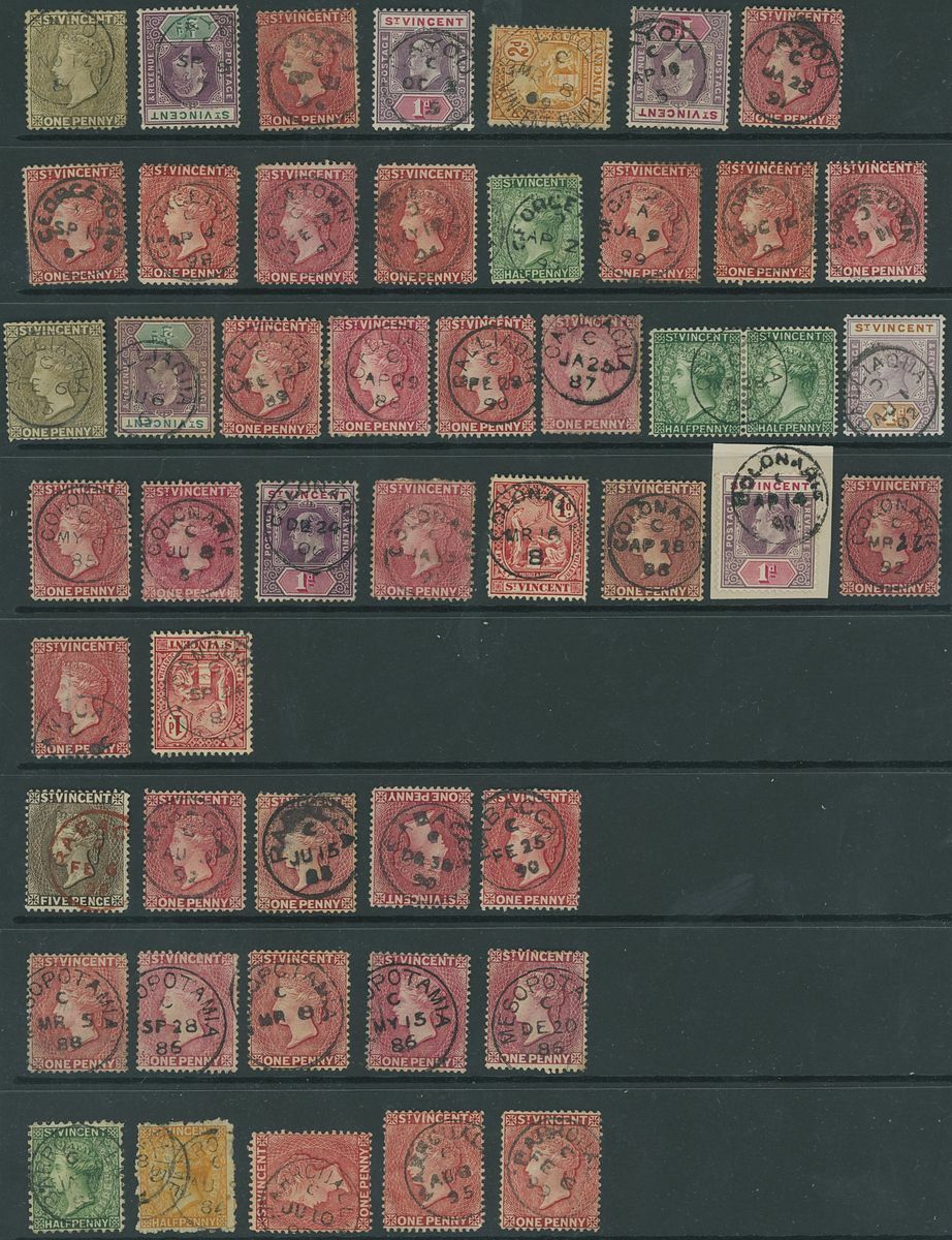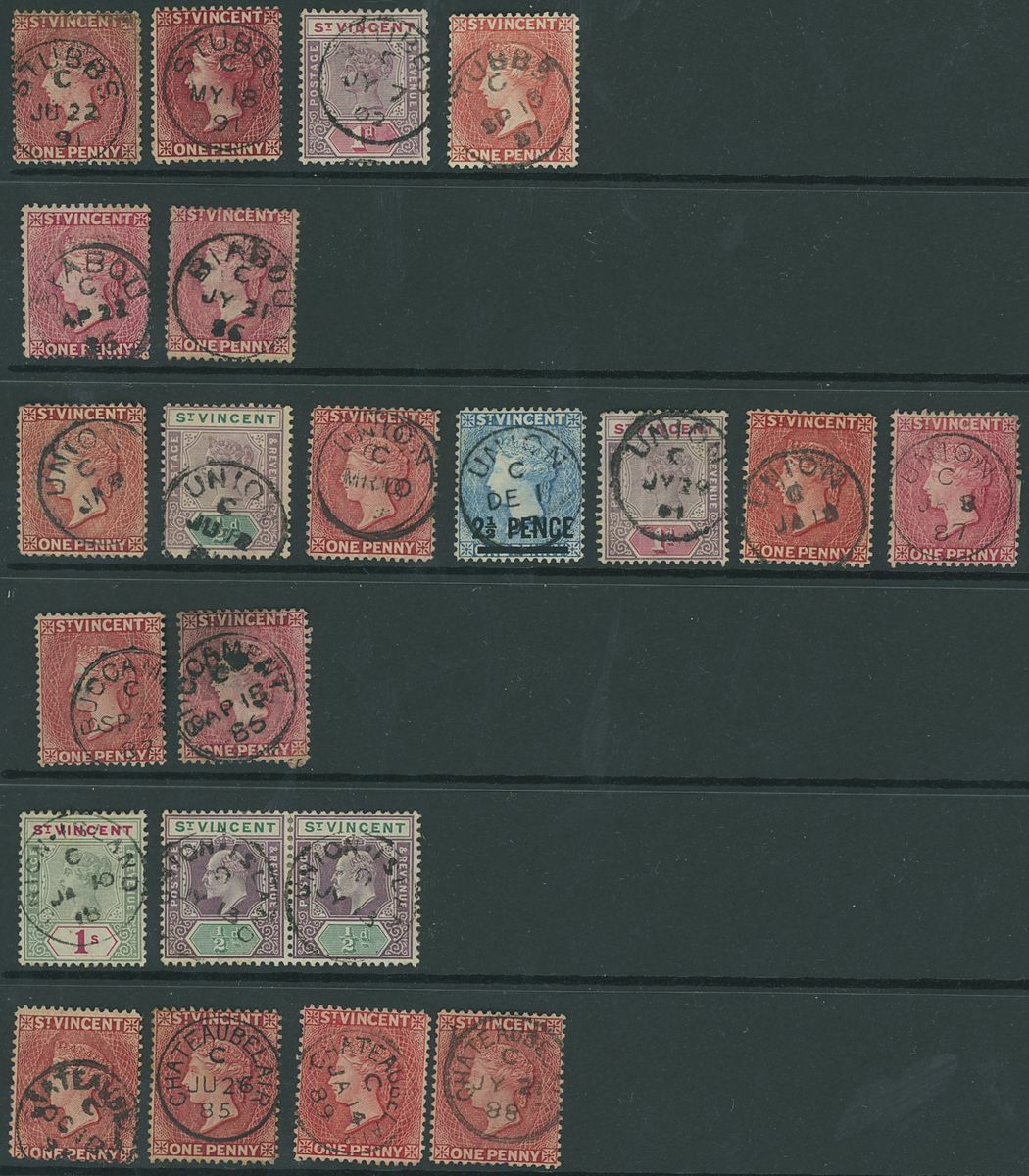 A range of selected strikes on two Hagner sheets, the majority on 1d. reds, comprising Barrouallie (5), Biabou (2), Buccament (2), Calliaqua (8), Canouan (2), Chateaubelair (4), Colonaire (8), Georgetown (8), Layou (7), Mesopotamia (5), Rabacca (5, one in red), Stubbs (4), Union (7) and Union Island (2); condition a little mixed though many fine
