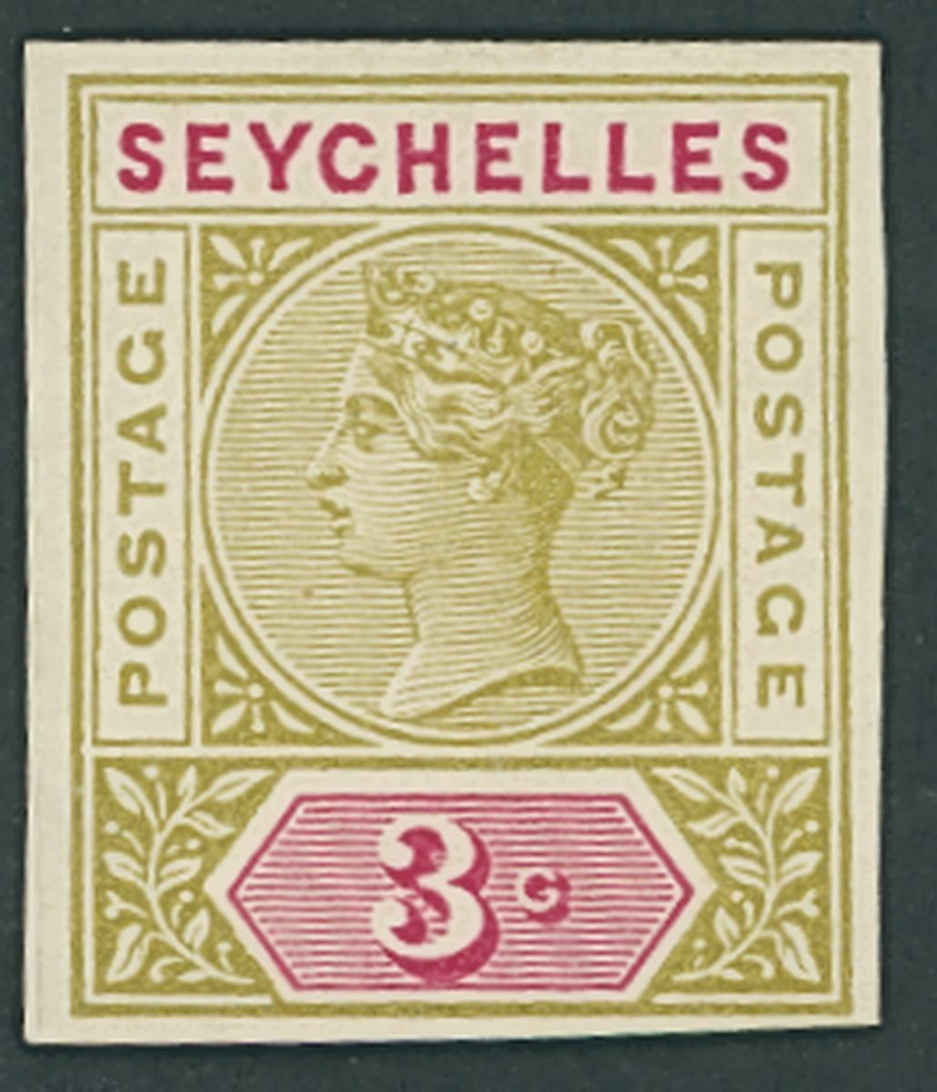 1890-92 3c. colour trial in pale olive-green and carmine on paper mounted on thin card; fine and attractive