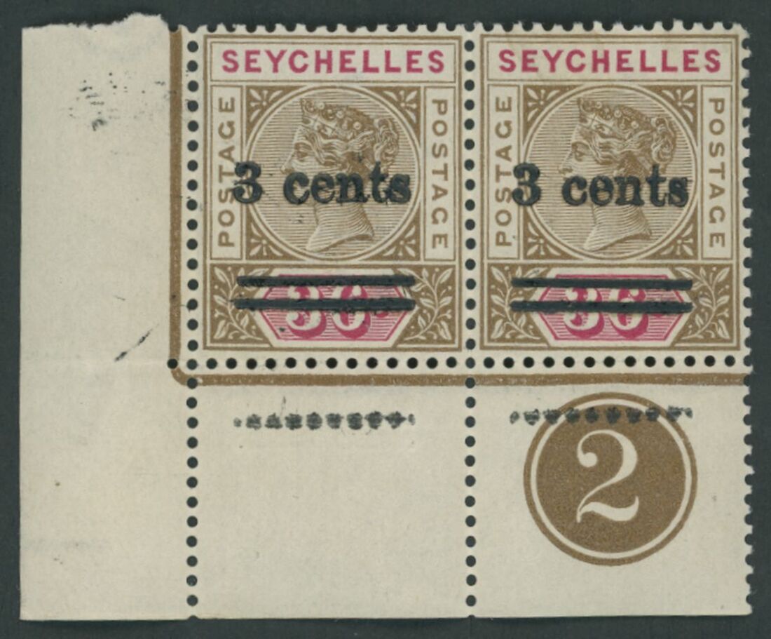 1901 3c. on 36c. brown and carmine, horizontal pair from the lower left of the sheet with plate number '2' and showing very heavy inked (almost double) surcharge and with a second albino surcharge in the margin at foot; a visually striking error; large part original gum. S.G. 39a var.
