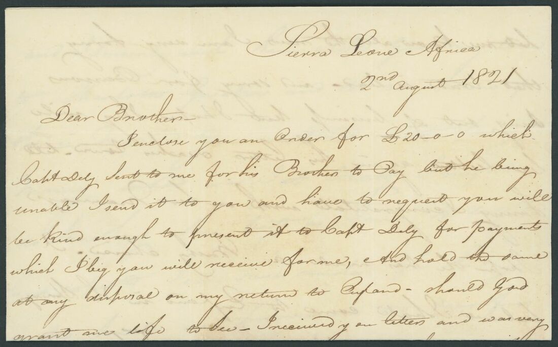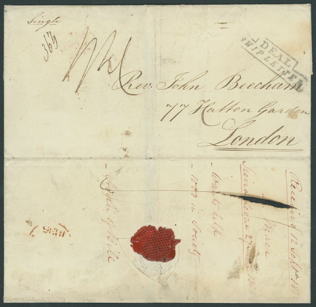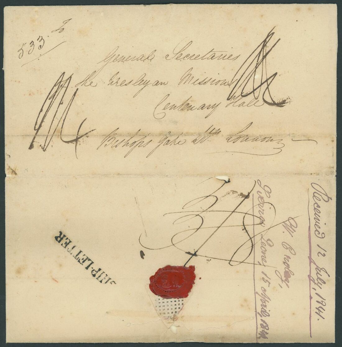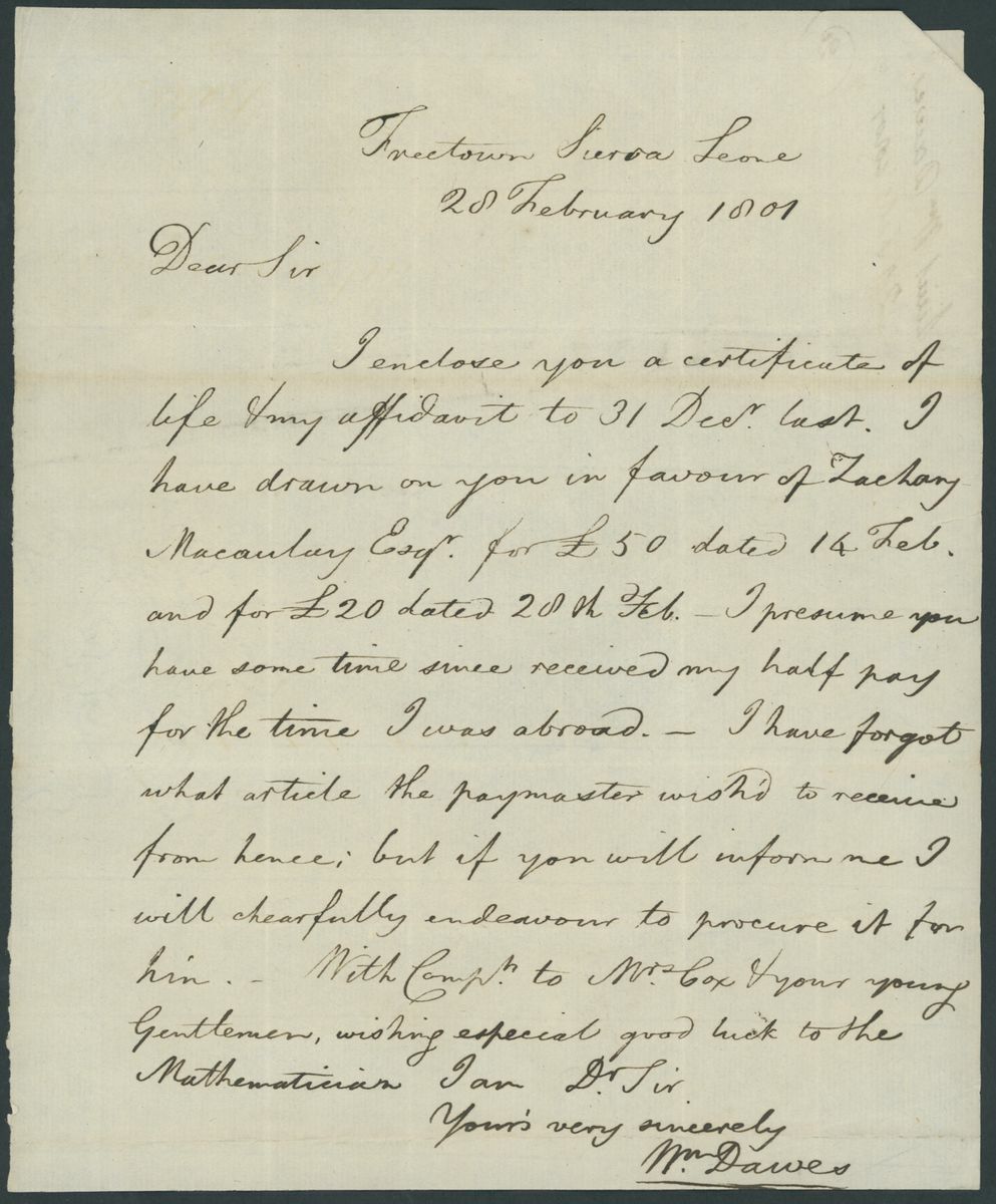1801 (28 Feb.) letter from William Dawes (Governor 1792-93, 1795-96 and 1801-1803); 1821 (2 Aug.) letter from a military officer serving in Sierra Leone to his brother in London; 1835 (27 June) entire to London, rated "1/4" and showing step-type